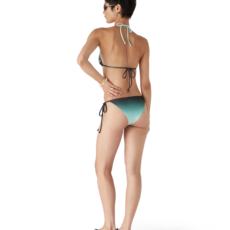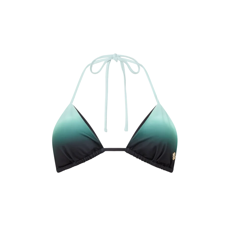 De Gradient-bikinitop is een bedrukt ontwerp, vervaardigd van een ademende technische zwemstof, met een mintkleurig kleurverloop dat is geïnspireerd op het kleurenschema van het Park Hyatt, een iconisch hotel in Tokio dat mint en zwart gebruikt in het interieurontwerp. Afgewerkt met striksluitingen bij de hals en op de rug – Dit kledingstuk is ontworpen om te worden gedragen met het bijpassende bikinibroekje.