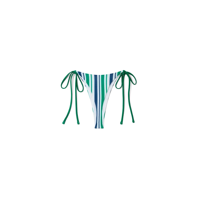 Het gestreepte stringbikini-broekje met seizoenskleuren en witte stringbandjes aan de heupen. Dit stuk is afgewerkt met groene versieringen en bedoeld om te dragen met de bijpassende top.