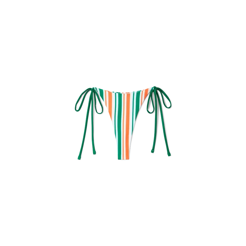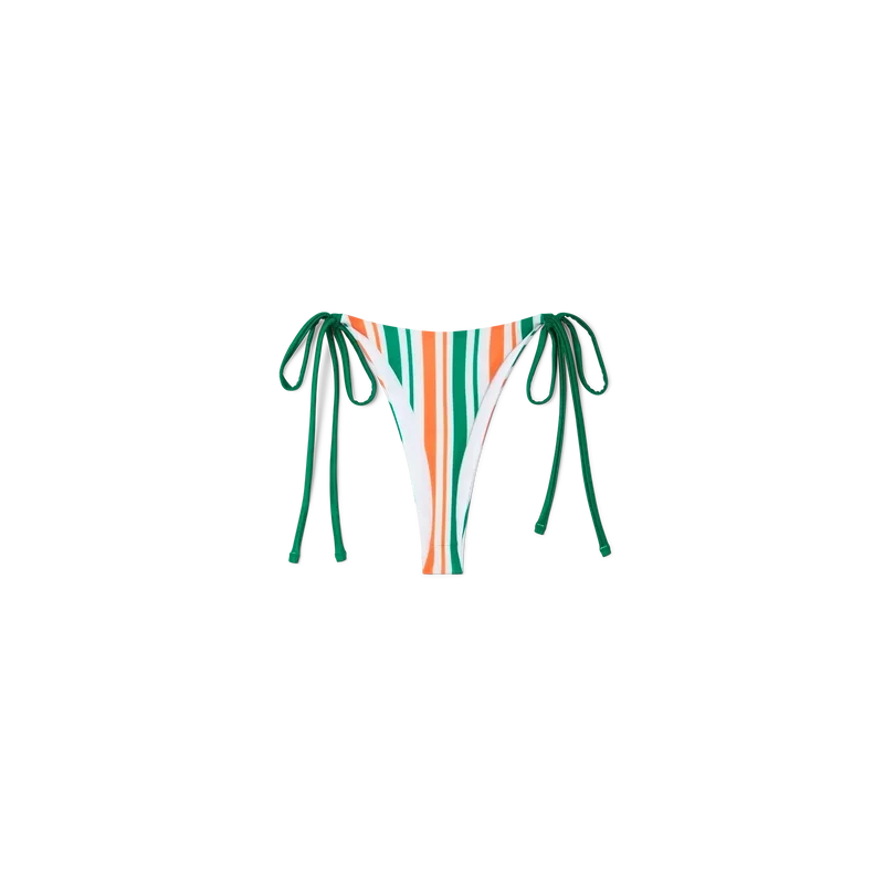 Het gestreepte string-bikinibroekje met seizoenskleuren en witte stringbandjes aan de heupen. Dit stuk is afgewerkt met groene details en bedoeld om te dragen met de bijpassende top.