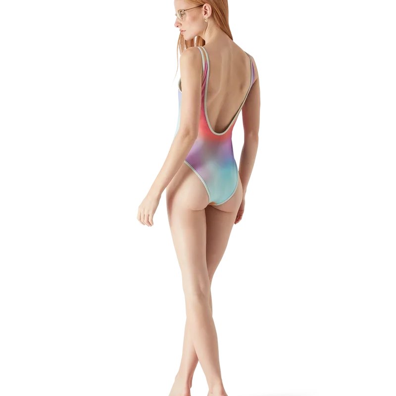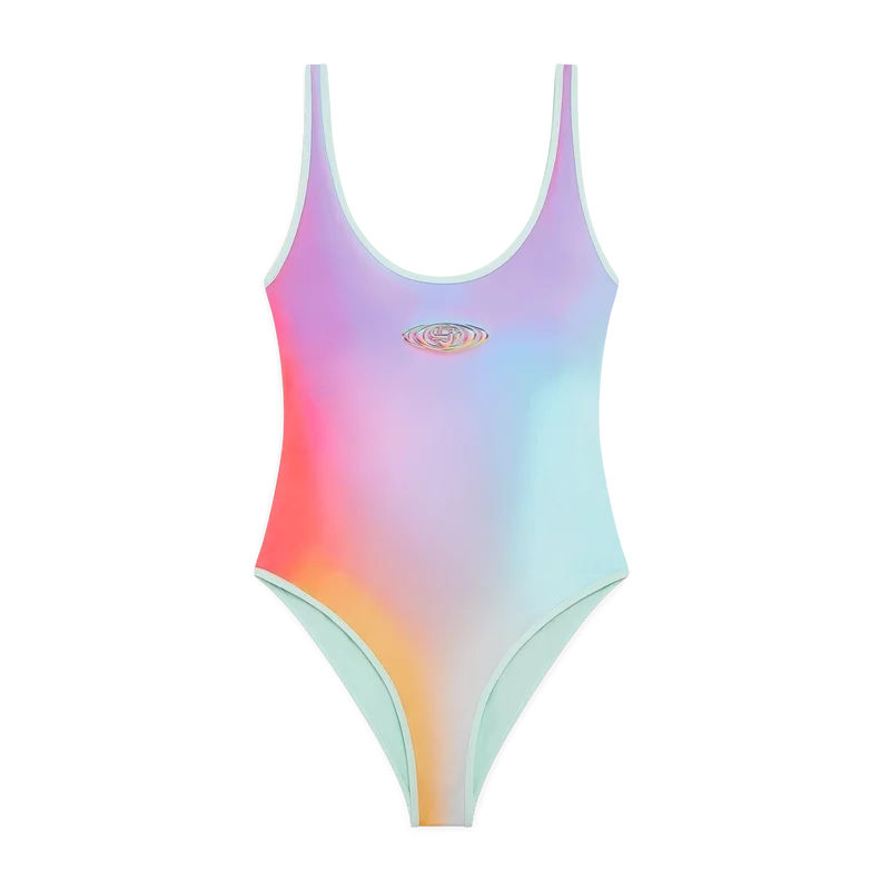 Het Glass Gradient-zwempak is een eendelig ontwerp met de unieke kunst van dit seizoen, gemaakt in samenwerking met Martin Naumann, bekend om zijn werk waarin hij kleurverlopen en textuureffecten combineert met halftoon- en glasachtige effecten. Afgewerkt met het Warped-logo van het huis, hoog uitgesneden pijpen, een uitgesneden rug en een ronde hals.