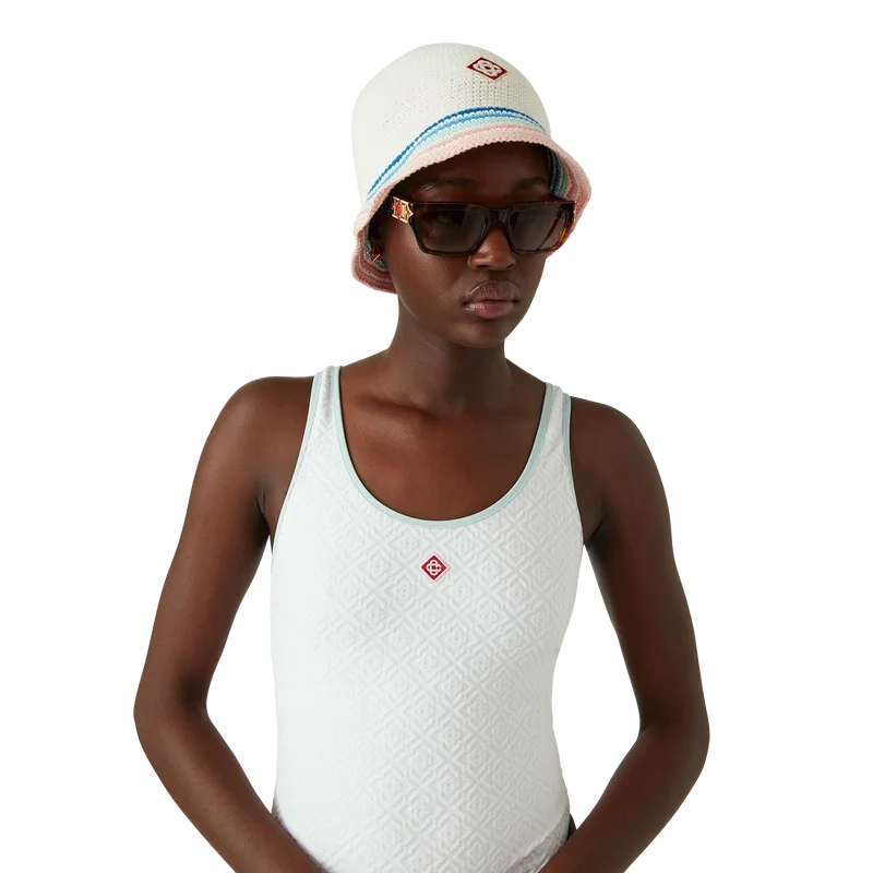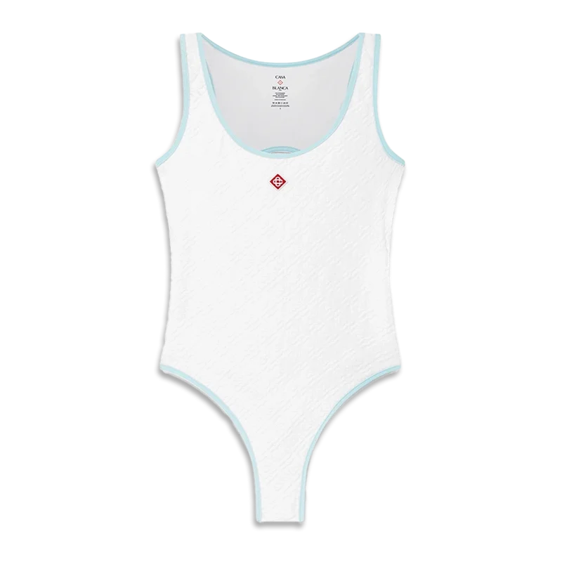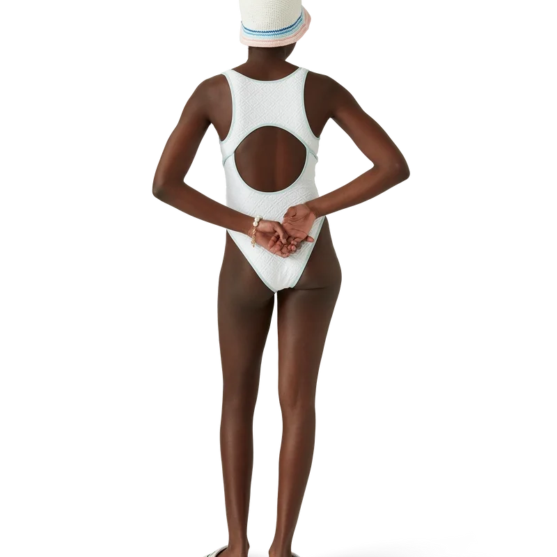 Het Jacquard Monogram-zwempak is een eendelig ontwerp, vervaardigd uit een ademende poly-mix stof, met het kenmerkende Diamond Monogram van het huis. Afgewerkt met blauwe randdetails, een uitgesneden rug en een ronde hals.<!–