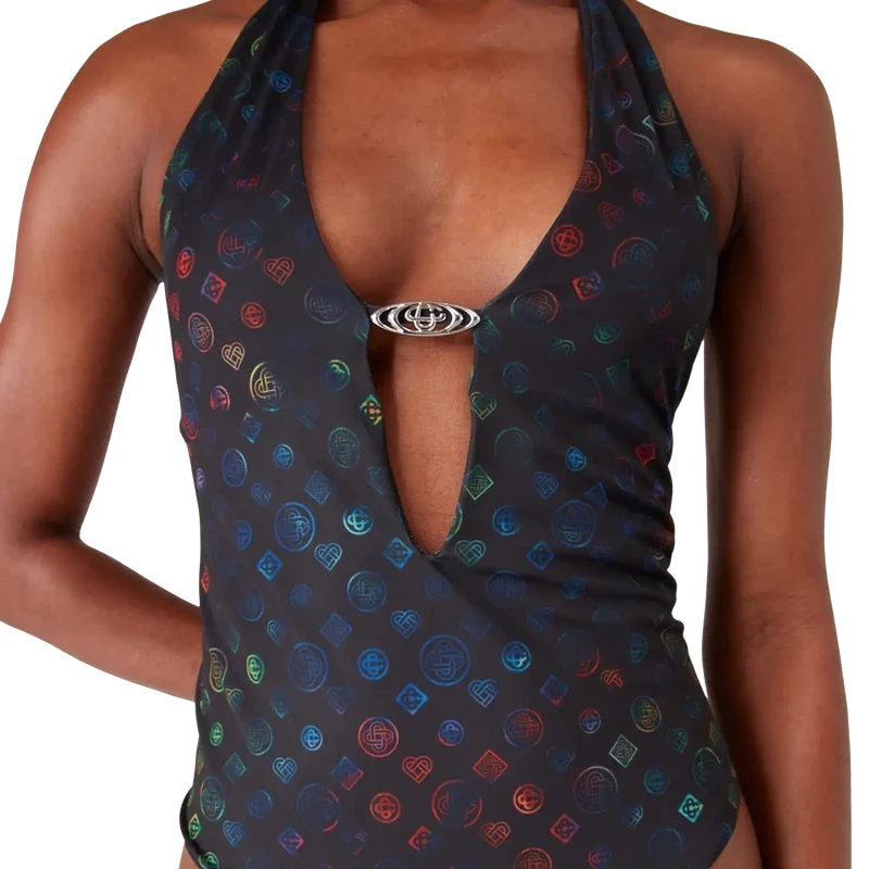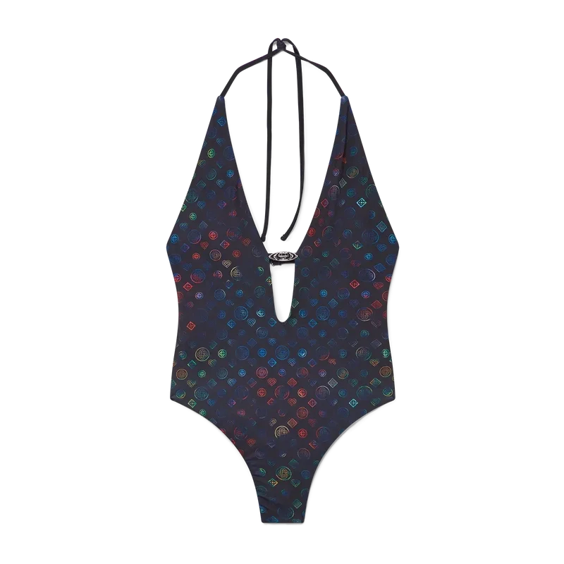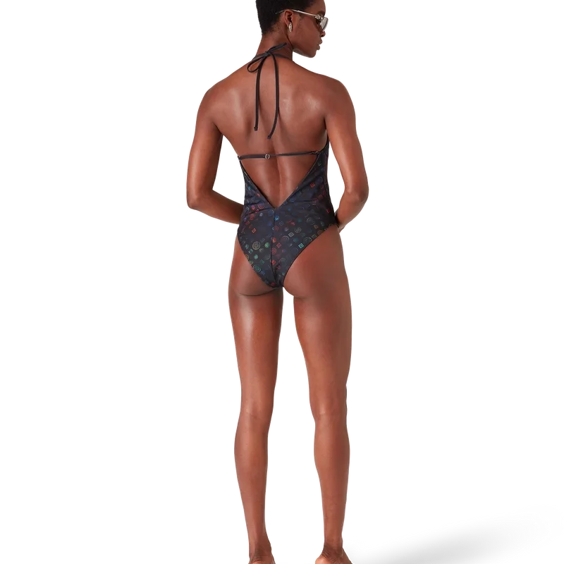 Het Plunge-zwempak is een rugloos eendelig ontwerp met de veelkleurige Icon Monogram-print van het huis. Afgewerkt met hoog uitgesneden pijpen, striksluitingen bij de hals en een diepe halslijn.