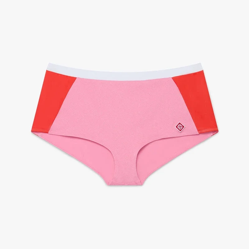 De roze Monogram-bikini-shorts hebben een verfijnd ontwerp met het kenmerkende Monogram-patroon van het huis in levendige roze, rode en witte kleuren. Afgewerkt met een witte tailleband en rode strepen aan de zijkanten. Ontworpen om te dragen met de bijpassende roze Monogram-rash-top.