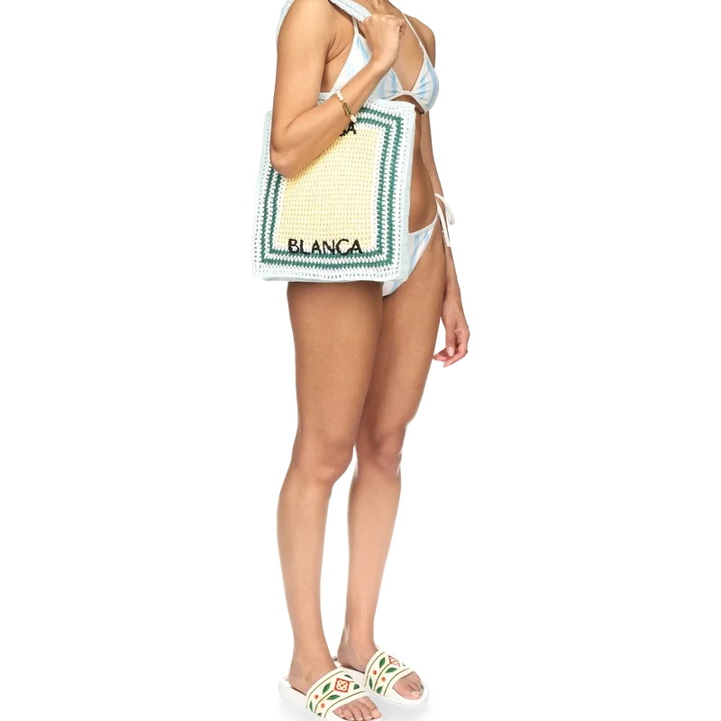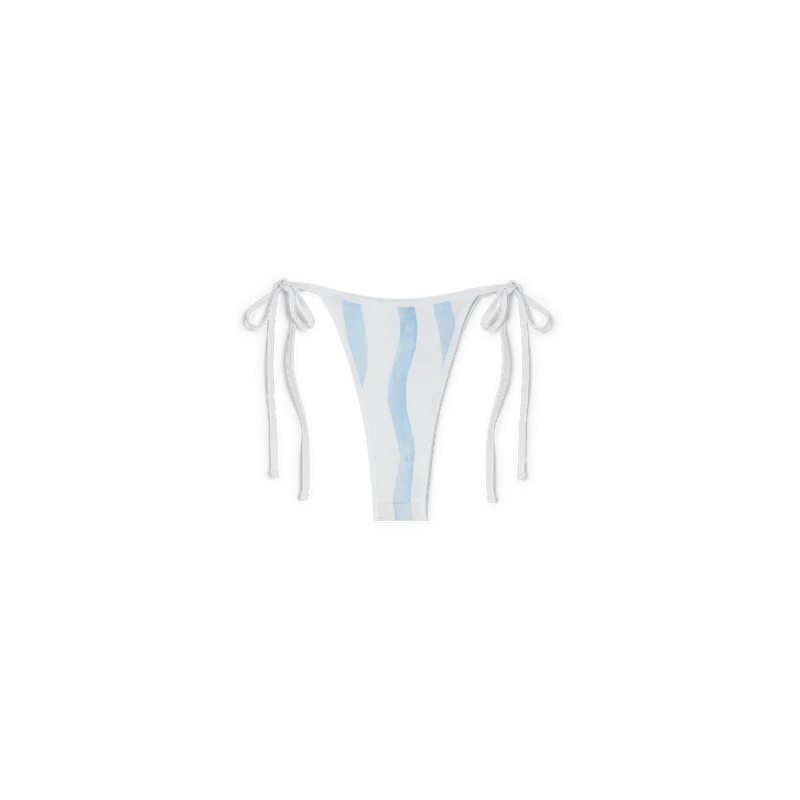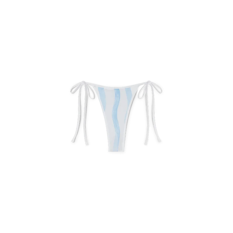 Het Wave-bikinibroekje heeft een blauw-wit golvend streepjespatroon en wordt aan de heupen vastgemaakt met witte touwtjes. Dit stuk is gemaakt van een poly-mix stof, heeft witte afwerkingen en is bedoeld om te worden gedragen met de bijpassende bikinitop.