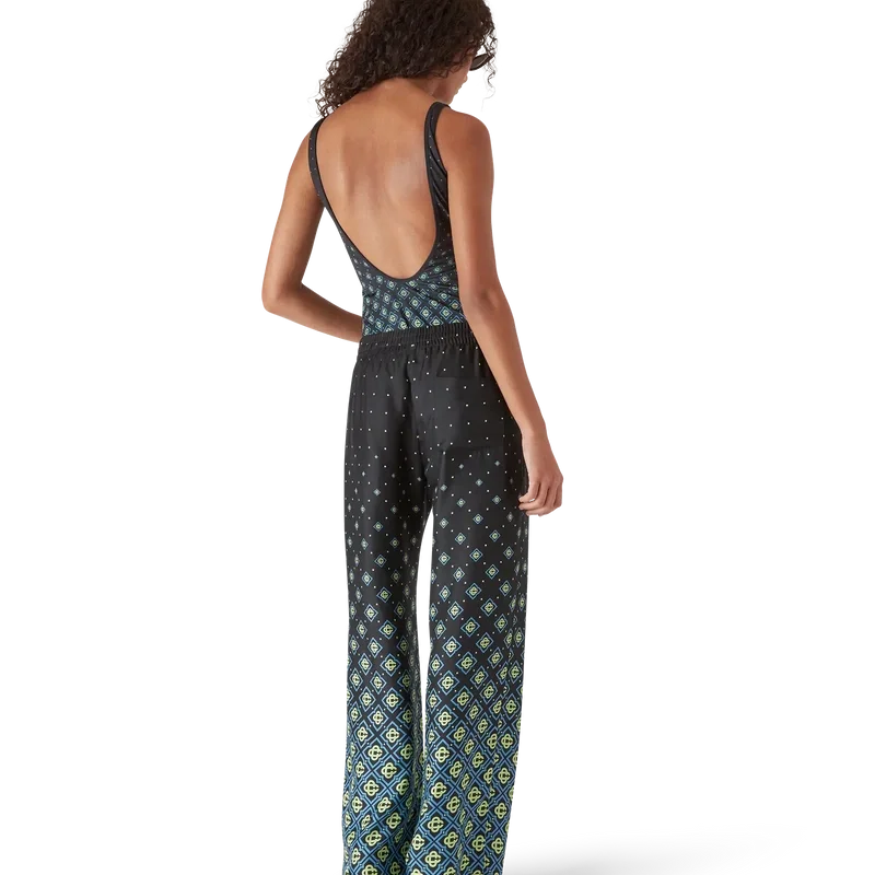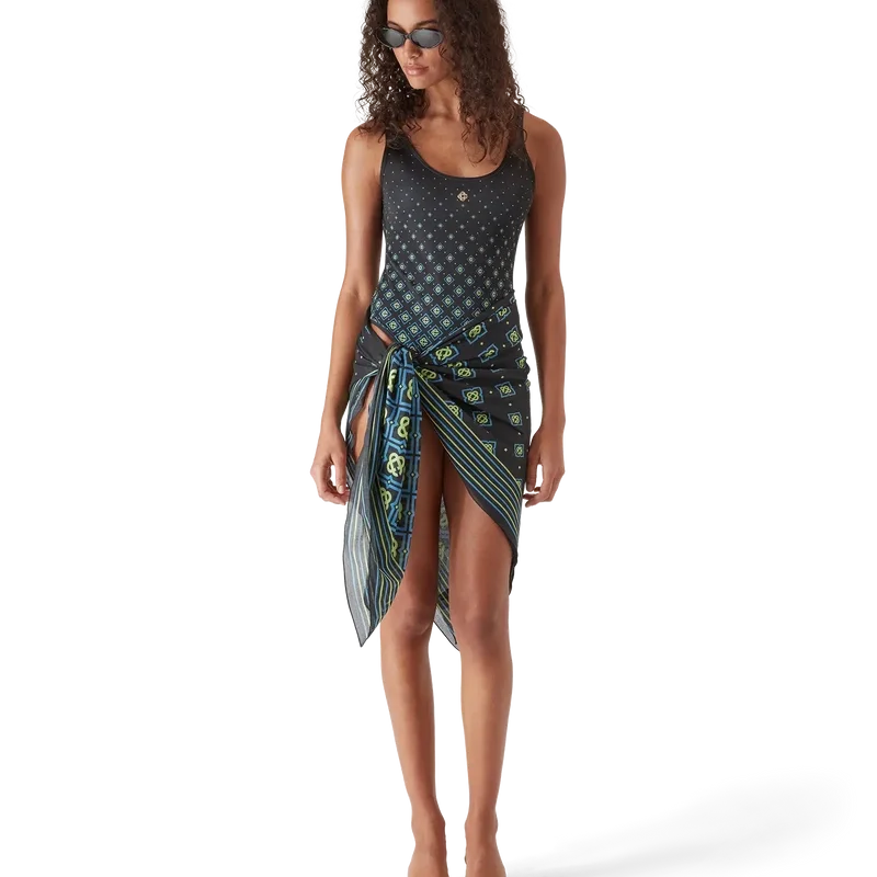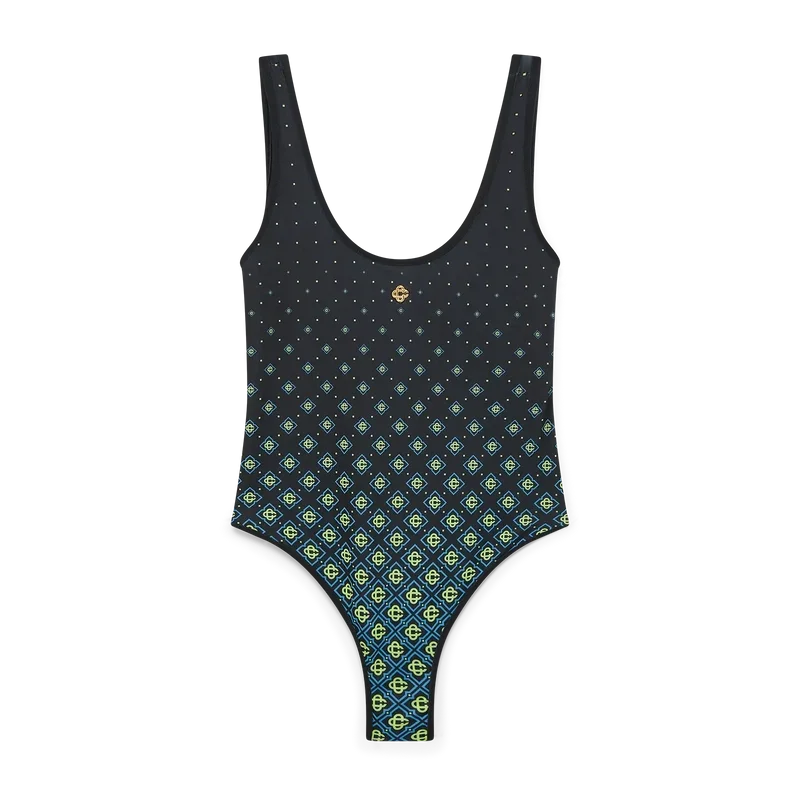 Het zwempak met zwart monogram in dégradé is een verfijnd ontwerp met het kenmerkende zwarte monogrampatroon van het huis. Afgewerkt met het kenmerkende diamantlogo van het huis op de borst, hoog uitgesneden pijpen, een ronde hals, een diepe ronde rug en randdetails.