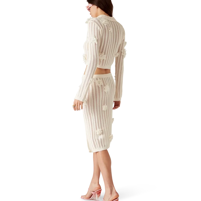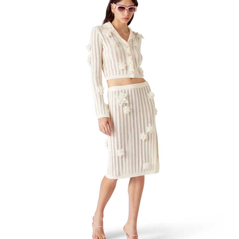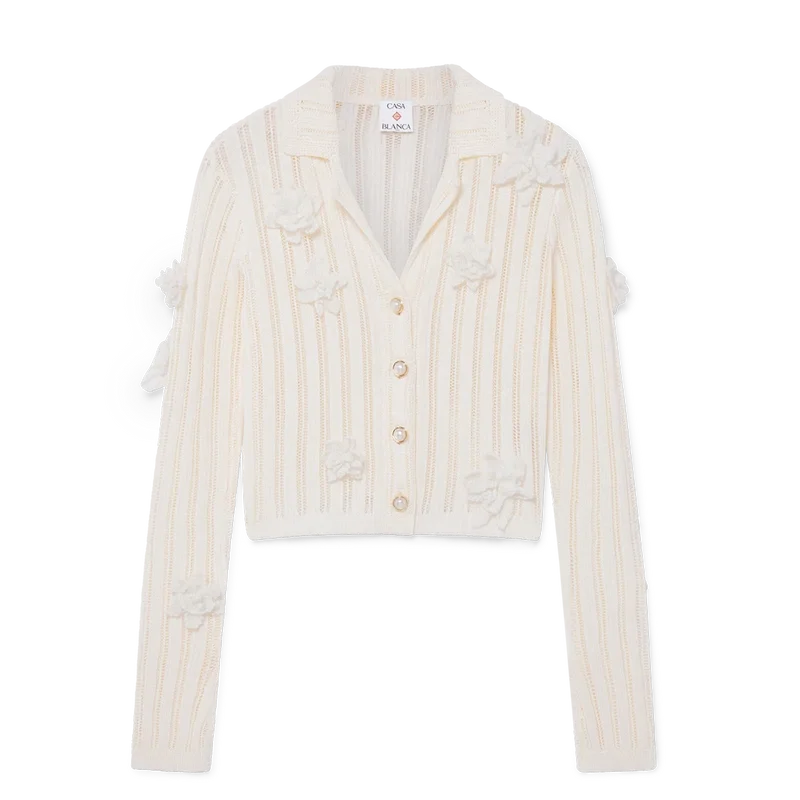 Het bloemenkant gebreide overhemd is een ontwerp met lange mouwen, vervaardigd van katoen met kantpatroon. Afgewerkt met klokmouwen met splitdetail, een kraag, knoopsluiting, kenmerkende gouden parelknopen en applicaties met bloemmotief.