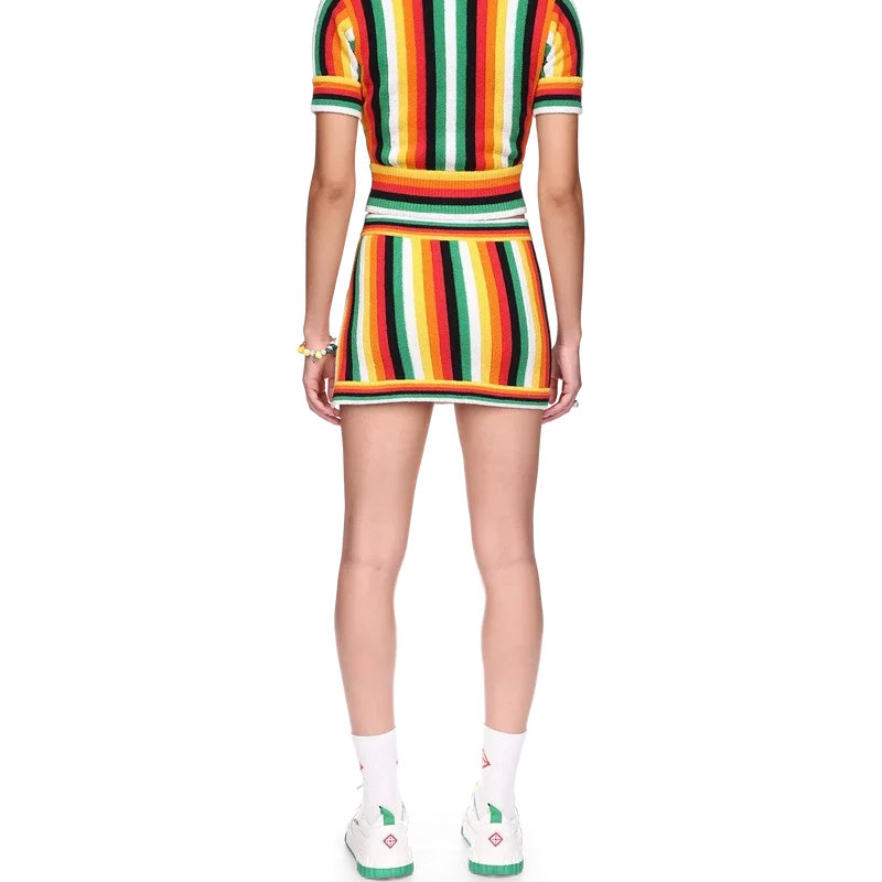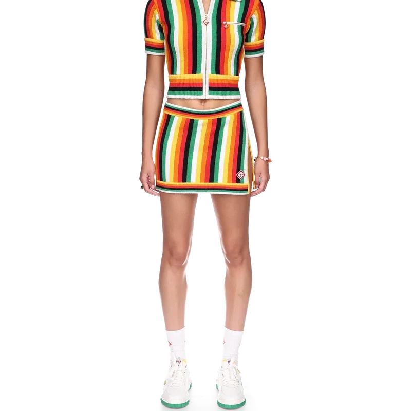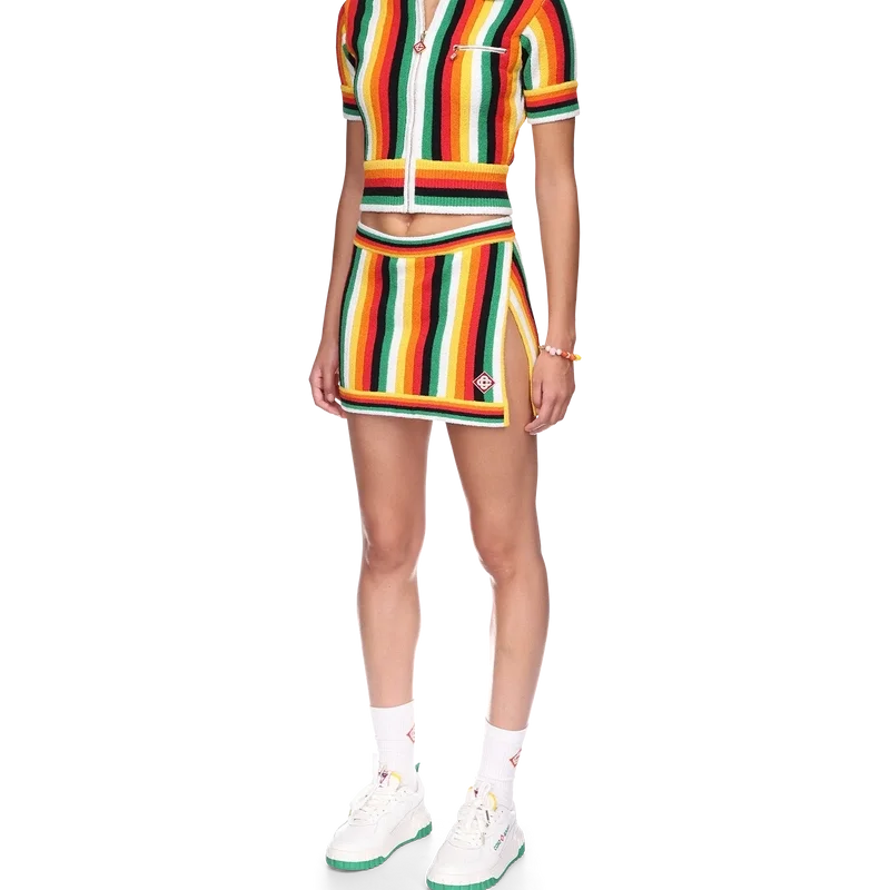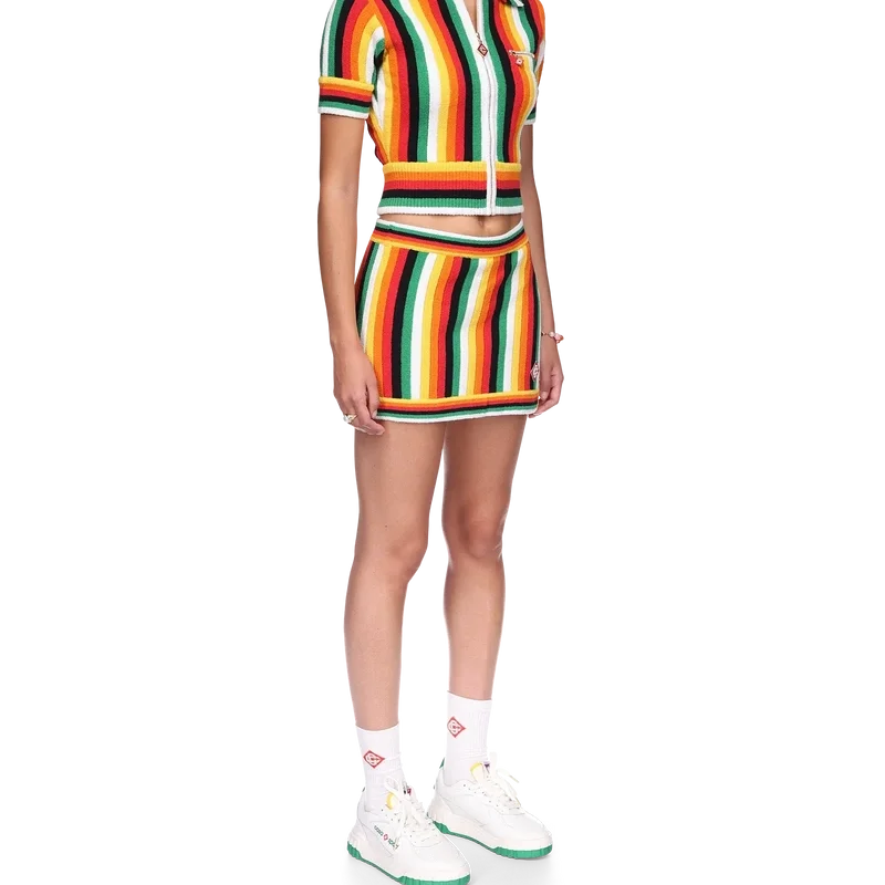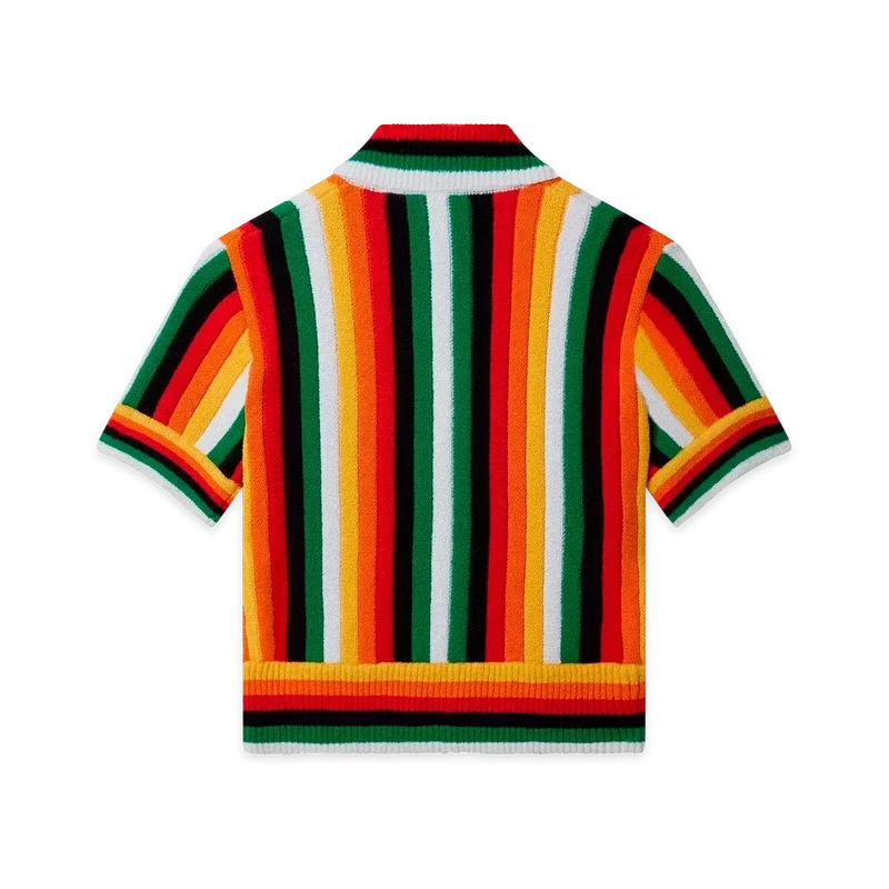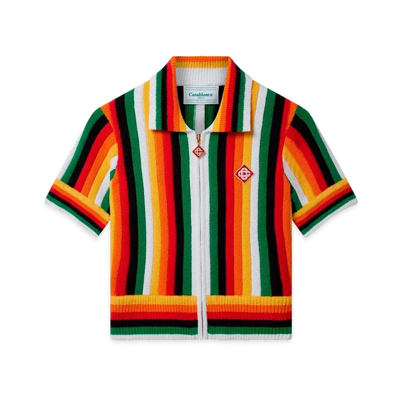 De gestreepte badstof top is een model met korte mouwen, vervaardigd van een gestreepte 3D-badstof van een katoenmix met seizoenskleuren en het kenmerkende diamantlogo van het huis. Afgewerkt met een ritssluiting, geribde kraag, zoom en manchetten.