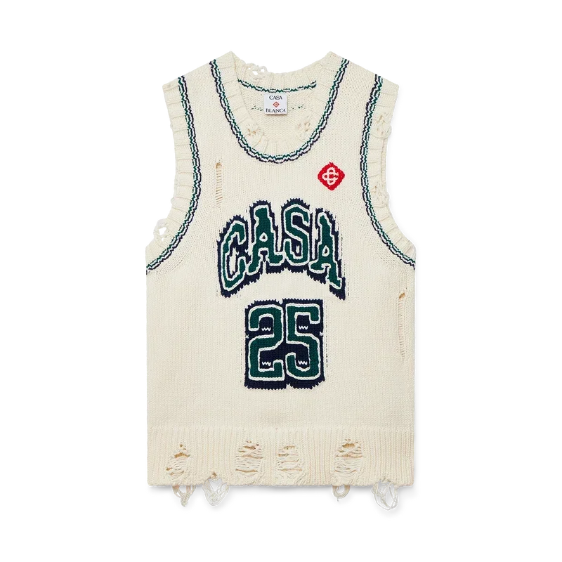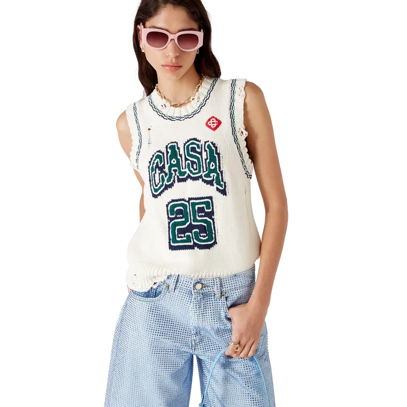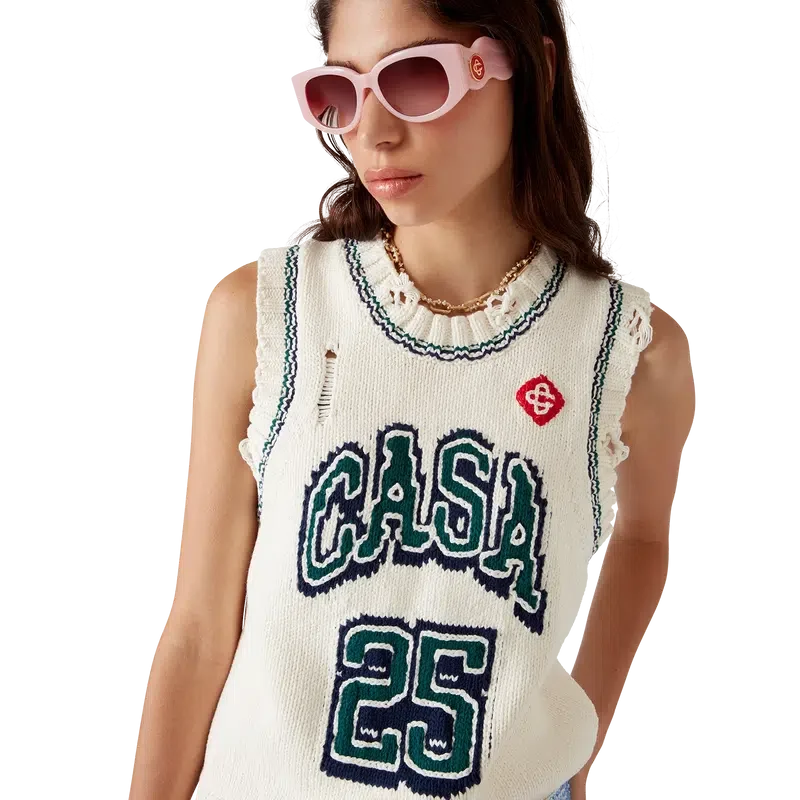 De Intarsia Baseball Top is een mouwloos topje met een distressed look, gemaakt van gebreide katoenen stof. Afgewerkt met Casa-tekst, het kenmerkende diamantlogo van het huis, een geribde ronde hals, armsgaten en zoom.