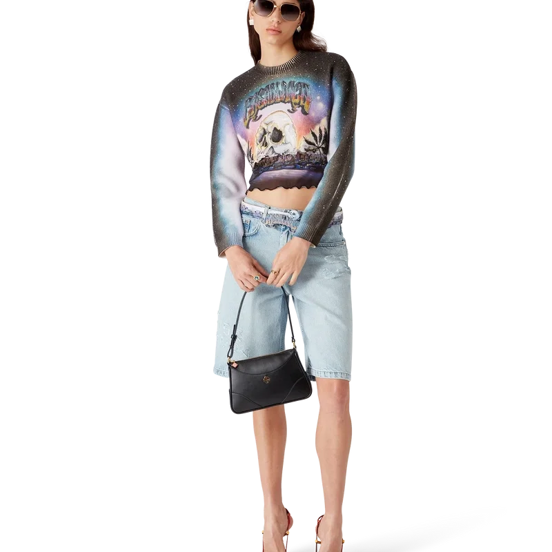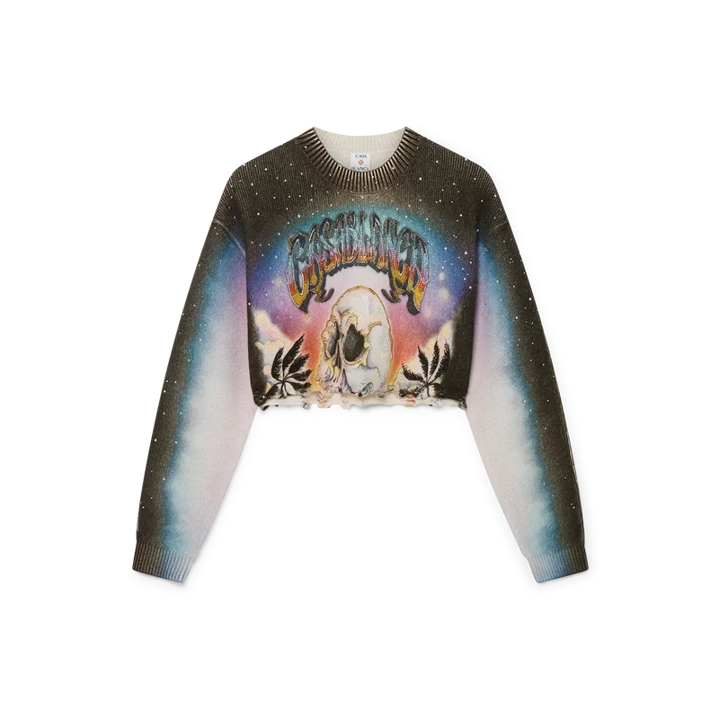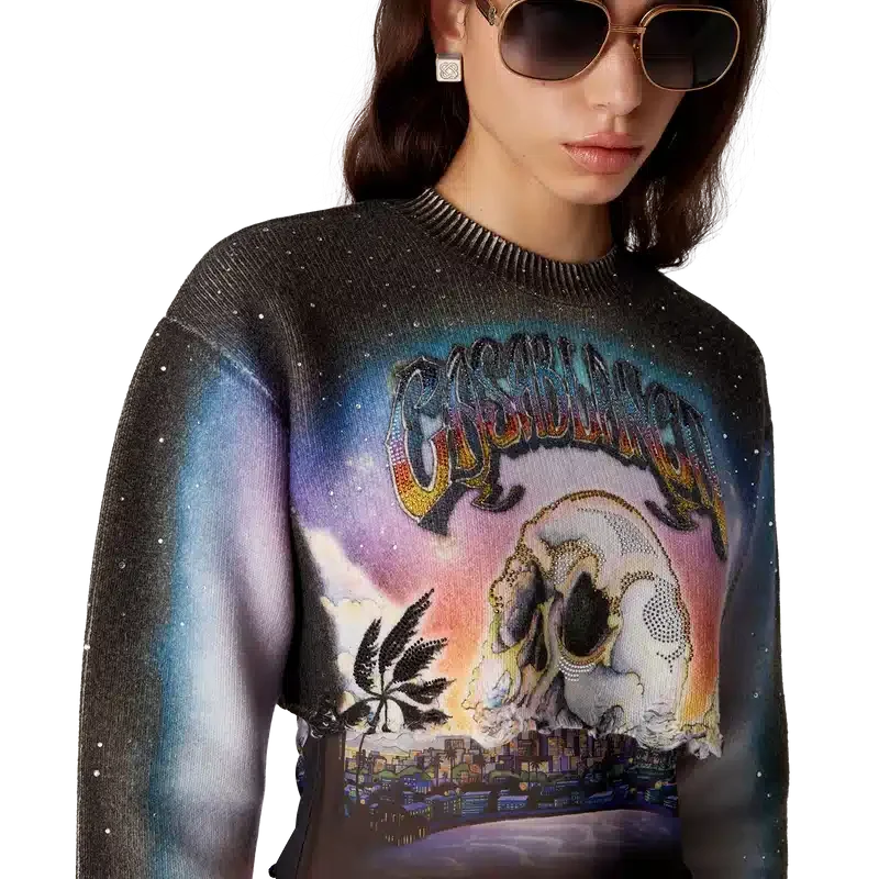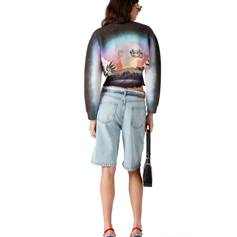 De La Pramonition Cropped Trui van Kasjmiermix is een kort model met lange mouwen, vervaardigd uit een bedrukte wollen stof met de kunst van dit seizoen, geïnspireerd door een griezelig visioen van de skyline van LA bij nacht, met UFO-elementen die verwijzen naar vintage sci-fi-inspiratie. Afgewerkt met een klassieke geribde ronde hals en geribde manchetten.