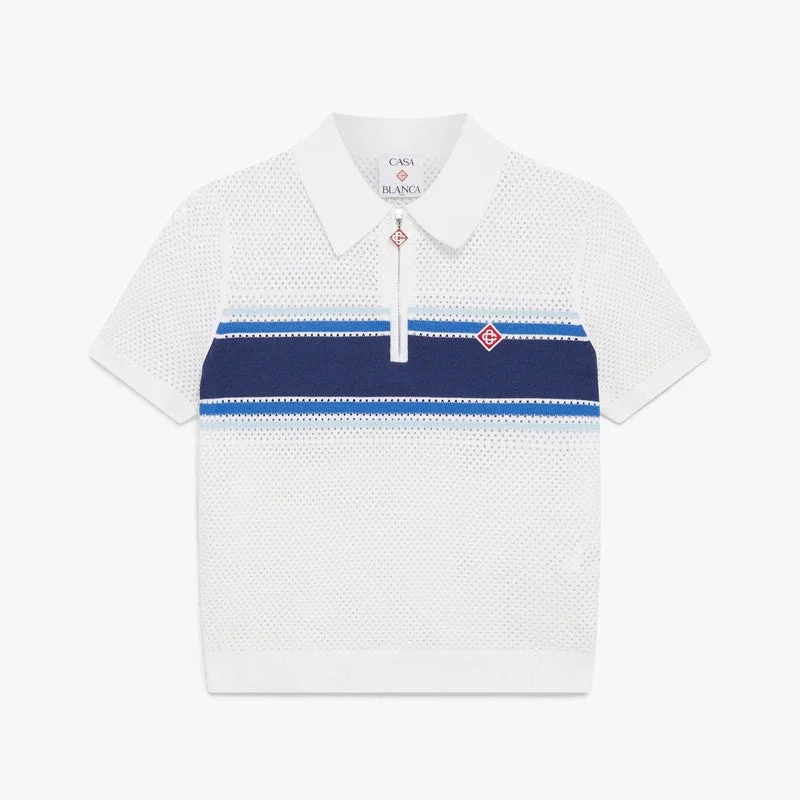 De wit-blauw gestreepte mesh top is een verfijnd gebreid ontwerp met een blauwe streep over de borst en rug. Afgewerkt met een klassieke geribde kraag, manchetten en zoom, korte mouwen, het kenmerkende diamantlogo van het huis en een ritssluiting in een slank silhouet. Ontworpen om te dragen met de bijpassende mesh minirok.