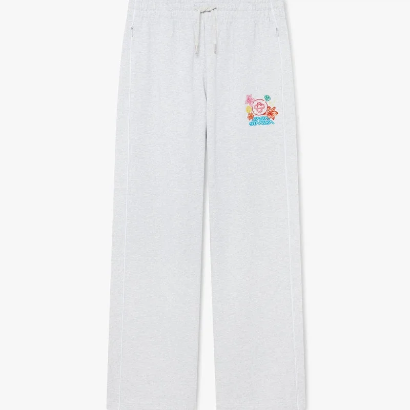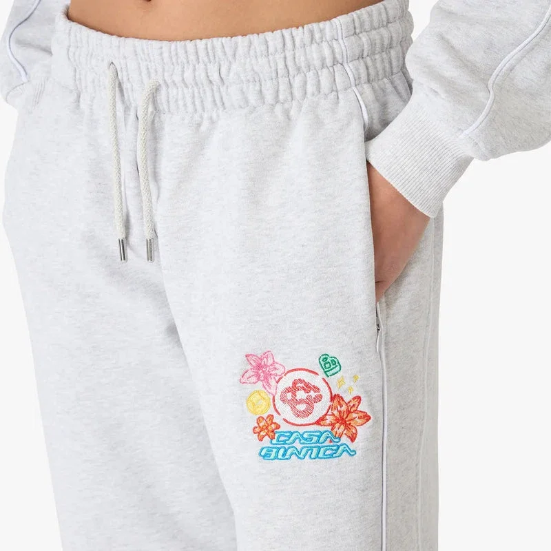 De grijze geborduurde cropped joggingbroek heeft een verfijnd ontwerp met de grafische collage-illustraties van dit seizoen, die de iconografie en ontwerpelementen voor het nieuwe seizoen weergeven met interpretaties van het logo, het smileygezicht en de orchidee. Afgewerkt met een elastische tailleband, trekkoordsluiting, biezen aan de zijkanten, steekzakken en een opgestikte zak aan de achterkant. Ontworpen om te dragen in combinatie met het bijpassende sweatshirt met capuchon.