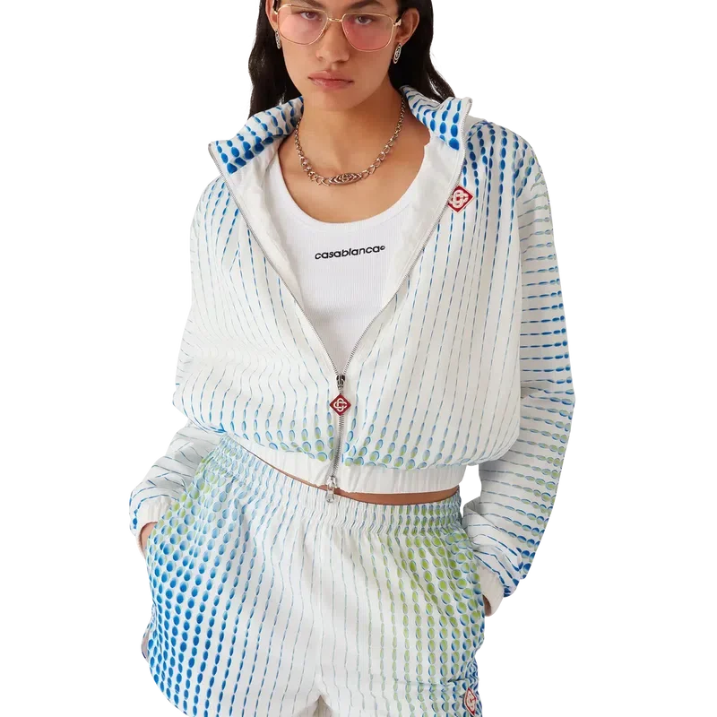 Het Dots windjack is een sportief ontwerp, vervaardigd uit technische tafzijde met het kenmerkende vakmanschap van het huis, voorzien van kleurverloopmotieven en textuureffecten. Afgewerkt met lange mouwen, een capuchon met trekkoordsluiting, elastische manchetten en zoom, een ritssluiting met het kenmerkende diamantvormige ritslipje van het huis en het diamantlogo van het huis.