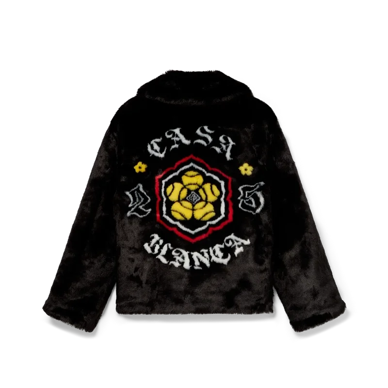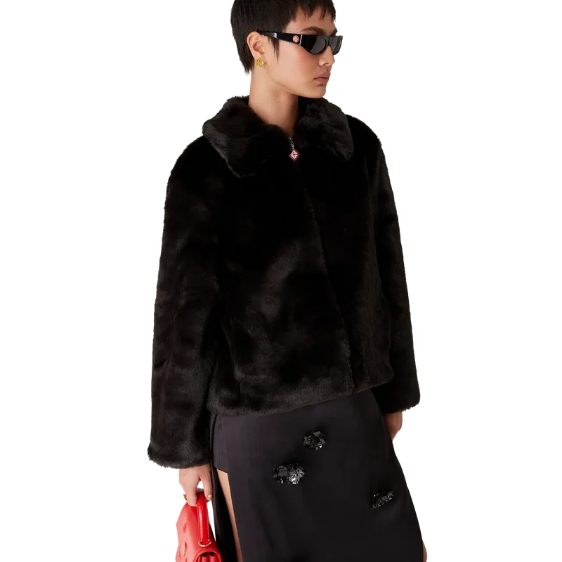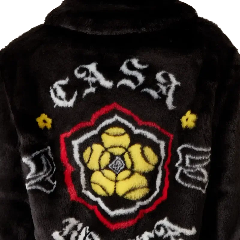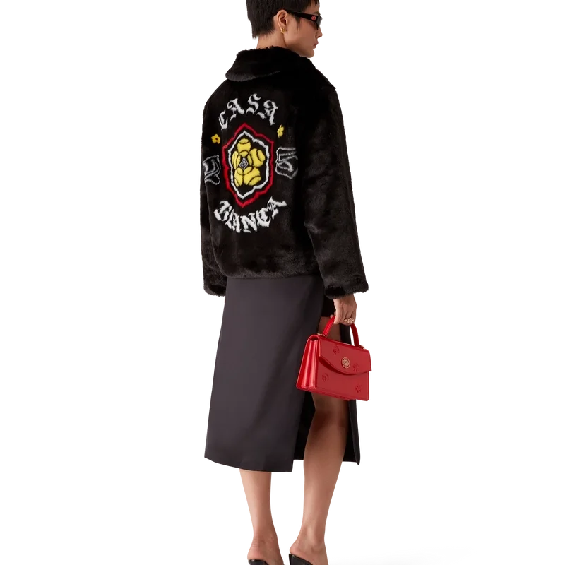 Het jasje van imitatiebont is een buitenkledingstuk met lange mouwen, voorzien van het ontwerp van dit seizoen, waarbij we ons voor een van onze hoofdthema’s hebben laten inspireren door de Japanse subcultuur van de BōSōZoku. Afgewerkt met een voering, een ritssluiting met het kenmerkende diamantlogo van het huis op het ritslipje, verticale paspelzakken en een voering.