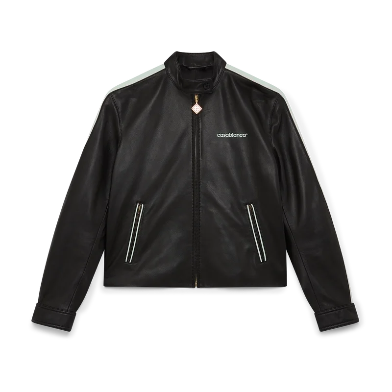 Het leren racejack is een slim-fit sportkledingontwerp, vervaardigd van lamsnappa. Afgewerkt met een ritssluiting, schuine voorzakken met ritssluiting, streepjesdetail langs de mouwen en het Casablanca-logo van het huis.