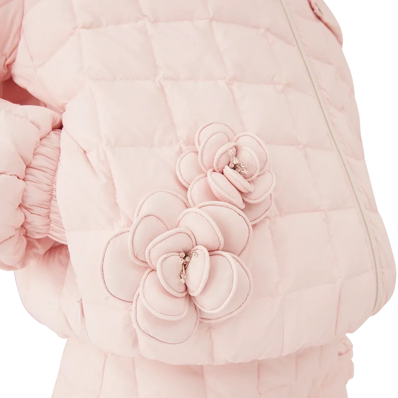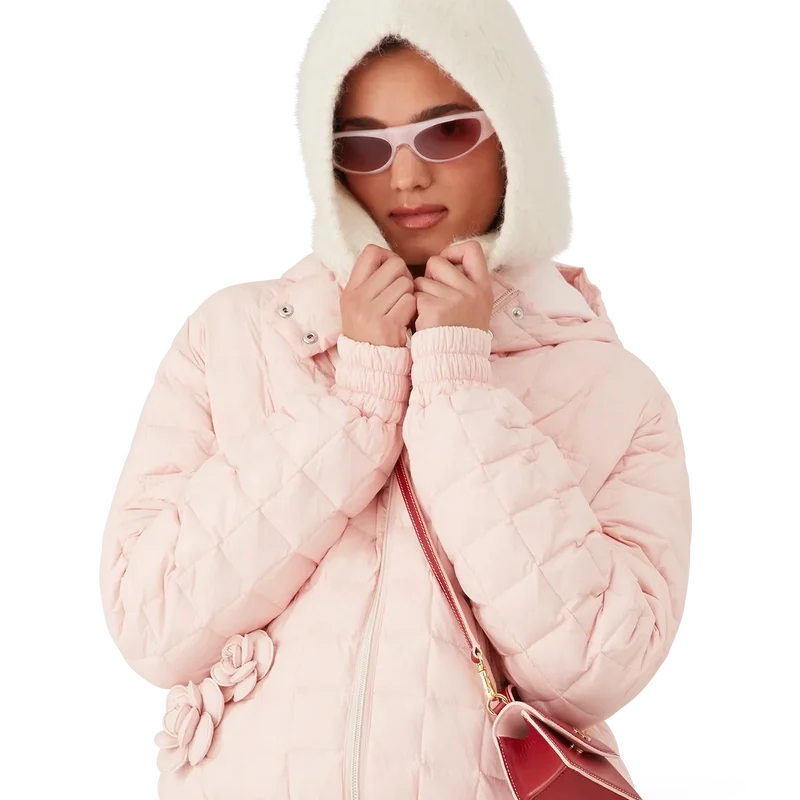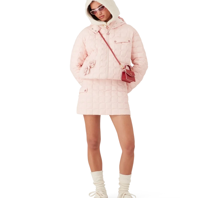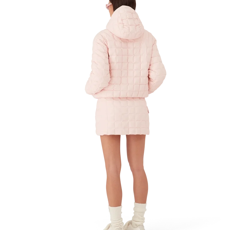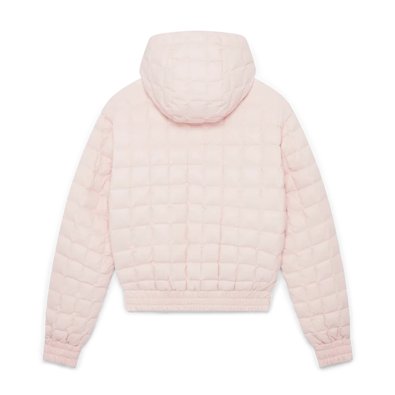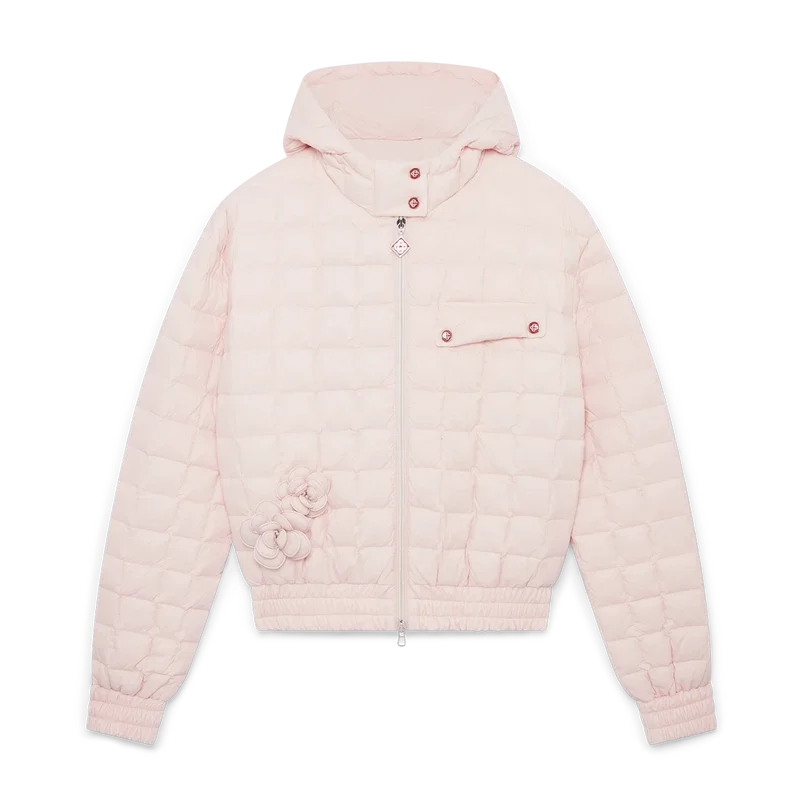 Het nylon gewatteerde jack met capuchon is een ontwerp met lange mouwen en een vierkant gewatteerd patroon. Afgewerkt met een capuchon, een ritssluiting, een klepzak met de in elkaar grijpende vergulde, geëmailleerde platte drukknopen van het huis, en elastische manchetten en zoom.