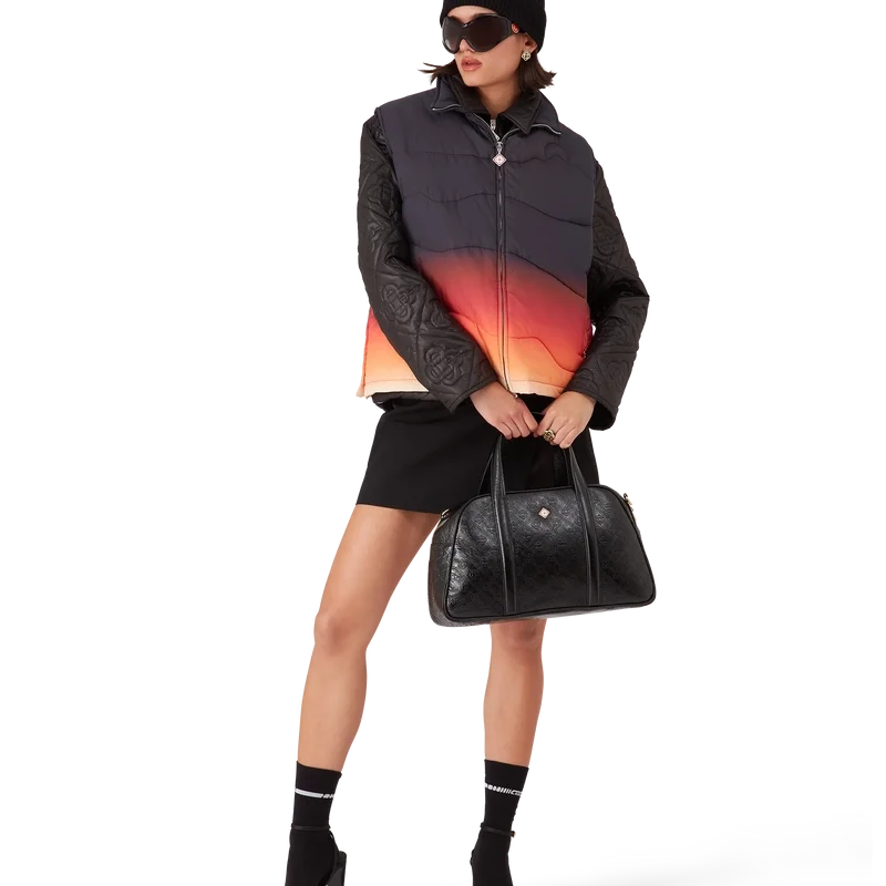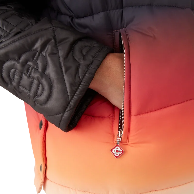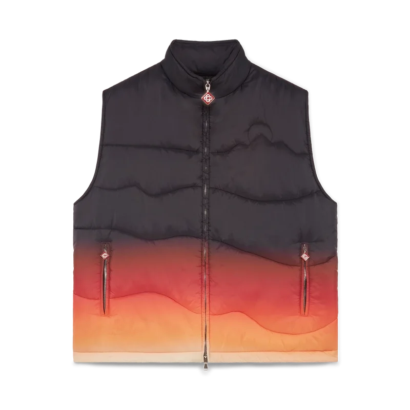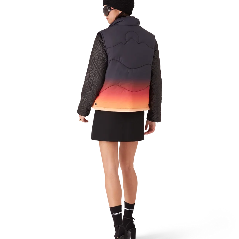 Het Gradient nylon puffer gilet is een verfijnd ontwerp voor buitenkleding, vervaardigd uit nylon met een kleurverloopprint, geïnspireerd door de adembenemende kleurovergangen van zonsopgang en zonsondergang boven het met sneeuw bedekte platteland van Japan. Het roept spectaculaire momenten op wanneer levendige luchten het landelijke berglandschap verlichten en dorpen gloeien tegen een dramatische alpiene achtergrond.