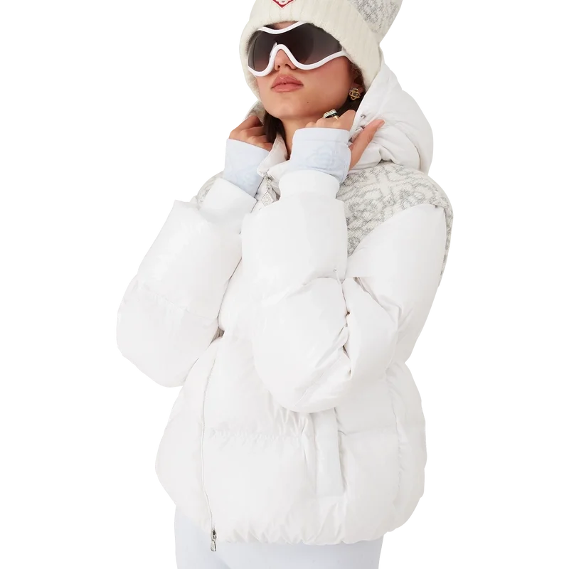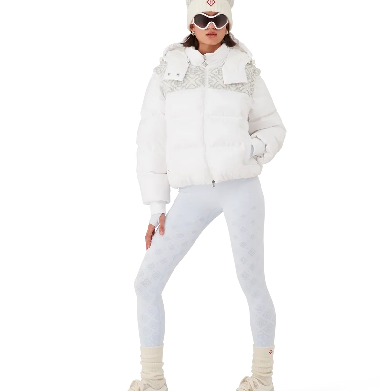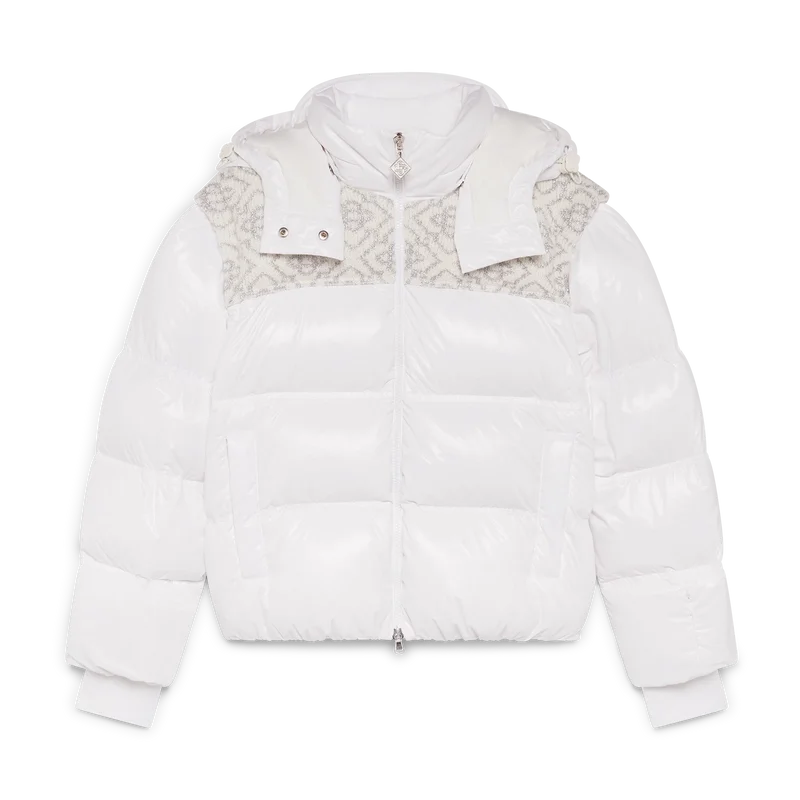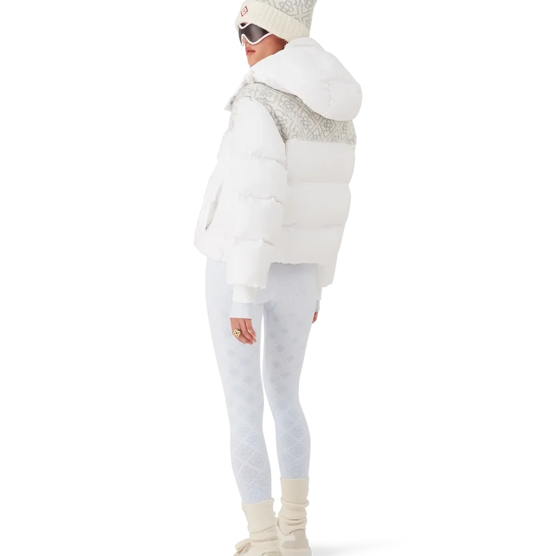 Het Ski Puffer-jack is een verfijnd ontwerp voor buitenkleding, vervaardigd uit ripstop nylon met donsvulling en een contrasterend monogram-jacquardpaneel over de schouders. Geïnspireerd door de ongerepte schoonheid van het besneeuwde platteland van Japan, waar torenhoge bergtoppen en verse poedersneeuw het landbouwgebied omtoveren tot eindeloze witte horizonten. Afgewerkt met een capuchon met Cc-logo-trekkers en trekkoordsluitingen, een opstaande kraag die extra warmte en bescherming biedt tegen de elementen, een ritssluiting met het kenmerkende diamantlogo van het huis op het ritslipje, voorzakken met ritssluiting, verstelbare manchetten met merklogo en elastische zoom en manchetten.