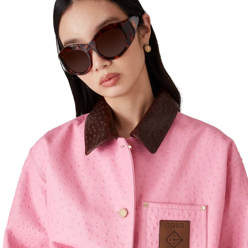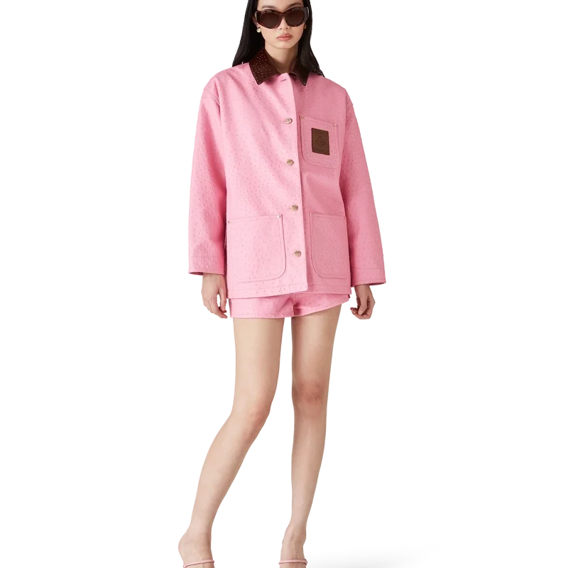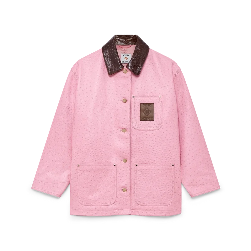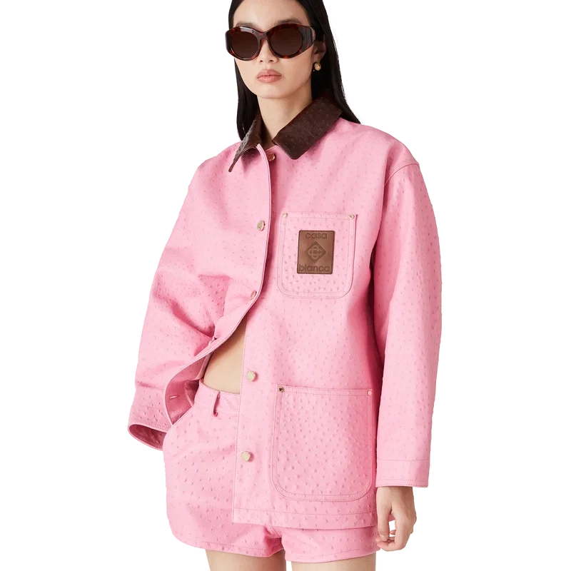 De werkjas van reliëfleer heeft een ontspannen, nonchalante stijl en is vervaardigd uit Italiaans kalfsleer. Afgewerkt met een print in struisvogeleffect, een contrasterende kraag, een borstzak met een leren patch met merklogo, opgestikte zakken aan de voorkant, een knoopsluiting en vergulde metalen details.