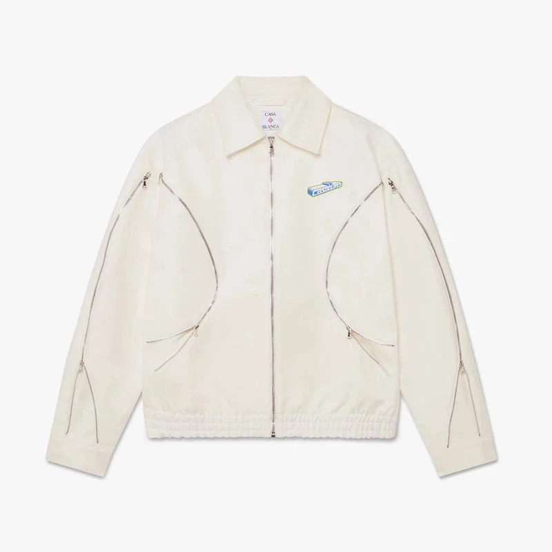 Het witte katoenen drill-jack met rits is een verfijnd ontwerp, vervaardigd uit duurzame katoenen drill-stof in fris wit. Afgewerkt met een ritssluiting met het Warped-logo op het ritslipje, een puntkraag, voorzakken met ritssluiting, ritsdetails op de mouwen en een relaxte pasvorm die de sport- en vrijetijdscodes van het huis belichaamt.