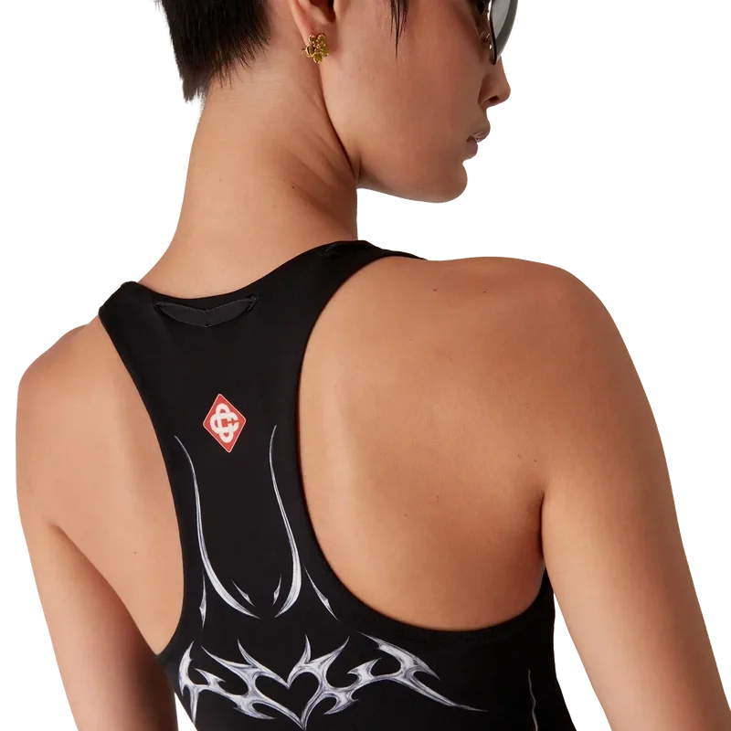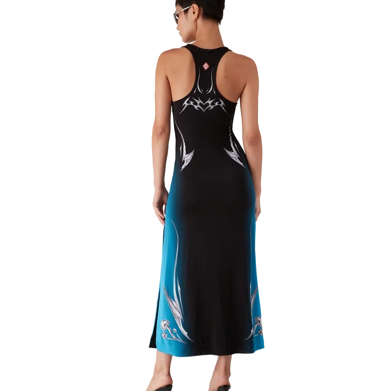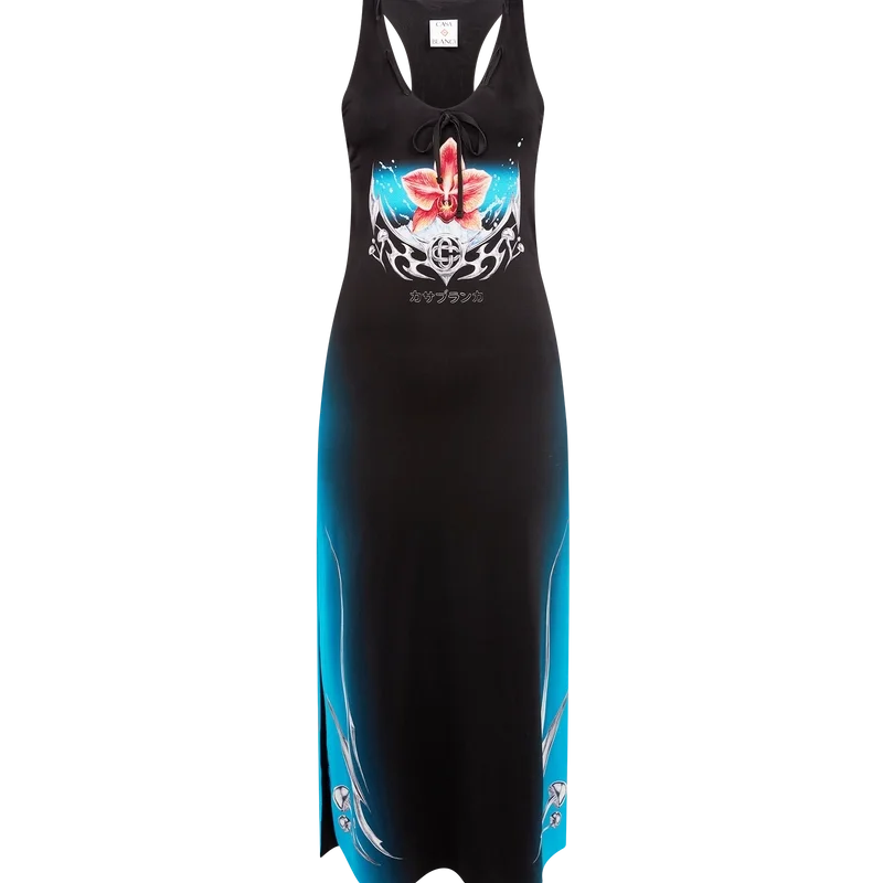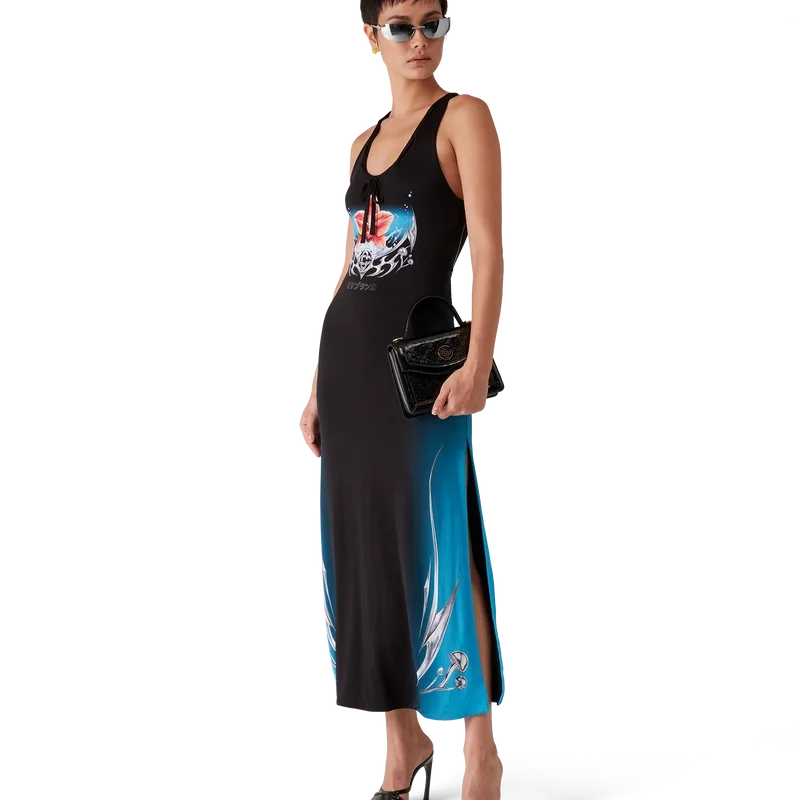 De Blades Slinky Jersey Jurk is een bedrukte, mouwloze maxi-jurk met het Blades-ontwerp van dit seizoen, dat speelt met het contrast tussen twee tegengestelde gevoelens: de scherpte van het mes en het koude, zilveren chroom, in contrast met de warmte van de natuur, zoals de gedurfde roze en rode tinten van een orchidee. De toevoeging van waterdruppels geeft het ontwerp een fris, helder element. Afgewerkt met een ronde hals en een racerback.