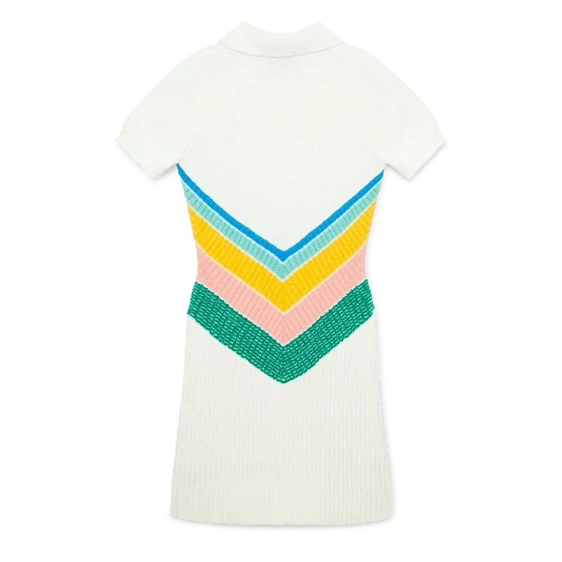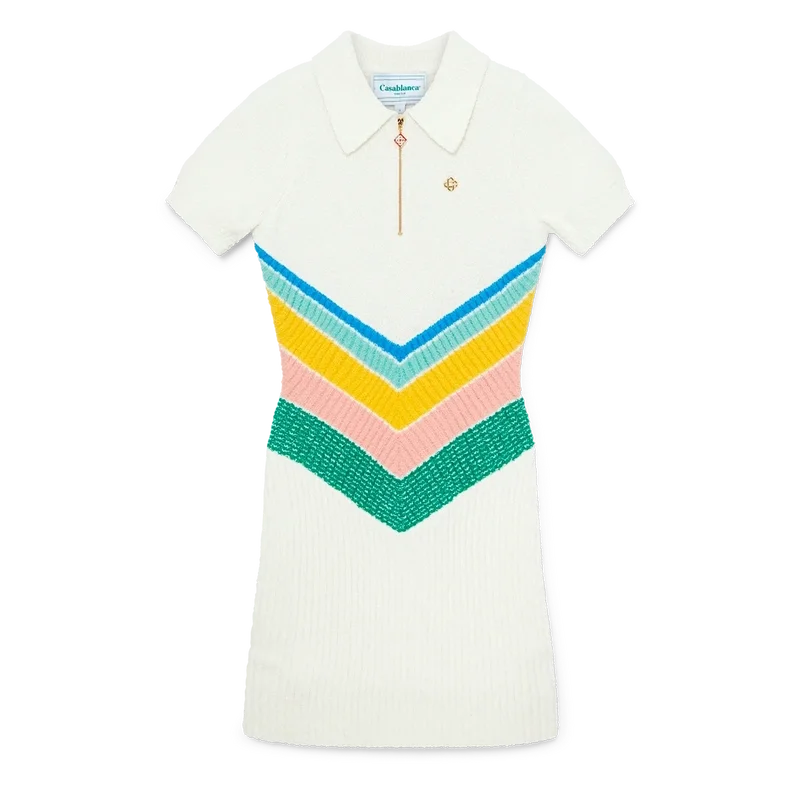 De Boucle Chevron-jurk is een getailleerde mini-jurk met korte mouwen, vervaardigd van bouclé-stof. Afgewerkt met het kenmerkende diamantlogo van het huis, een ritssluiting bij de hals, een veelkleurig chevronpatroon op het lijfje in de pastelkleuren van dit seizoen, een kraag en een geribbeld bouclé-rokpaneel.