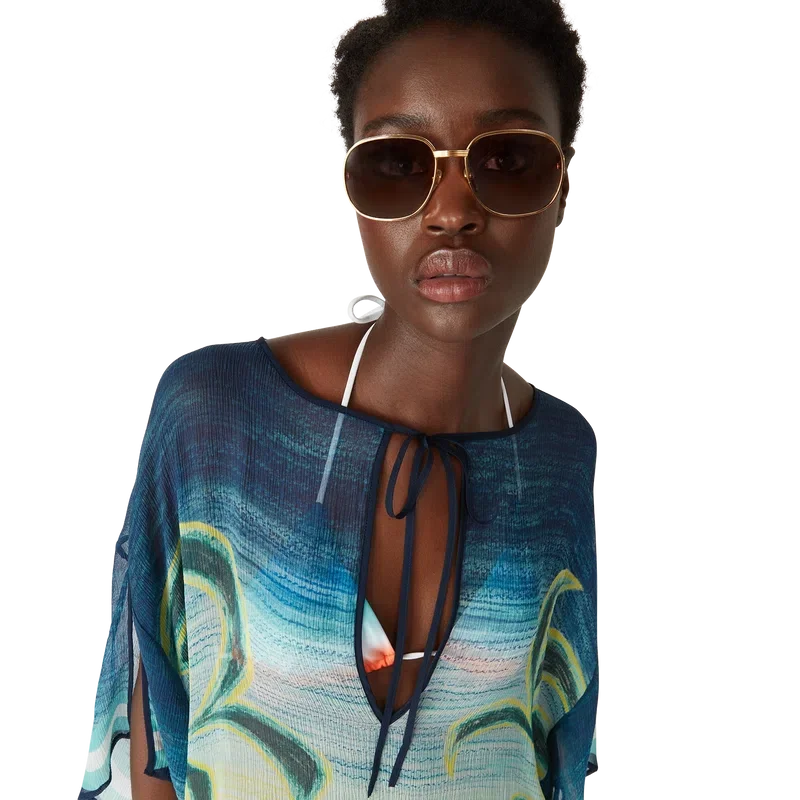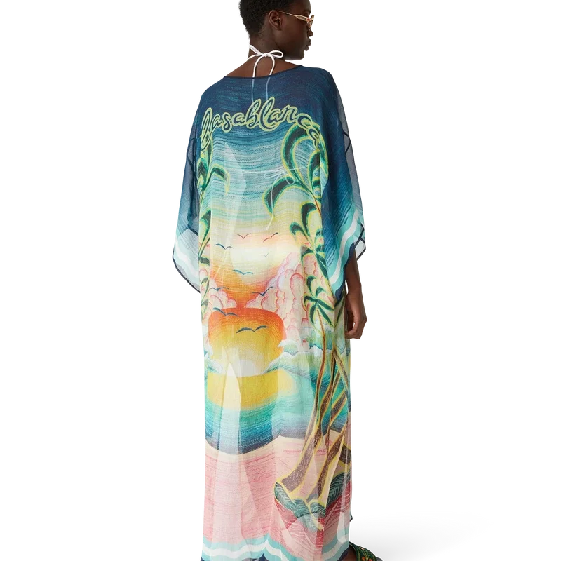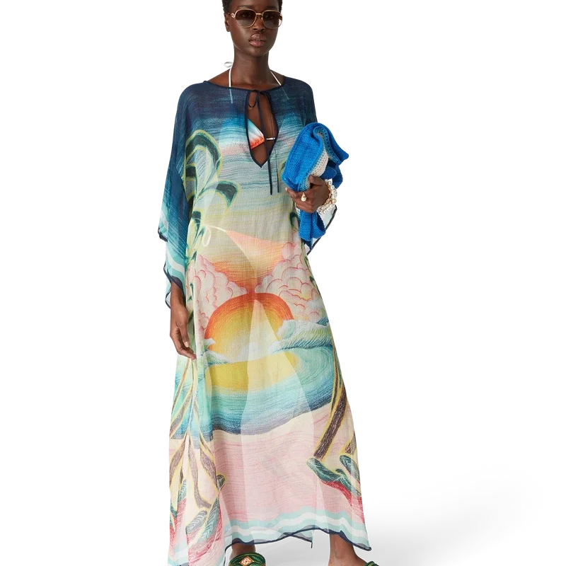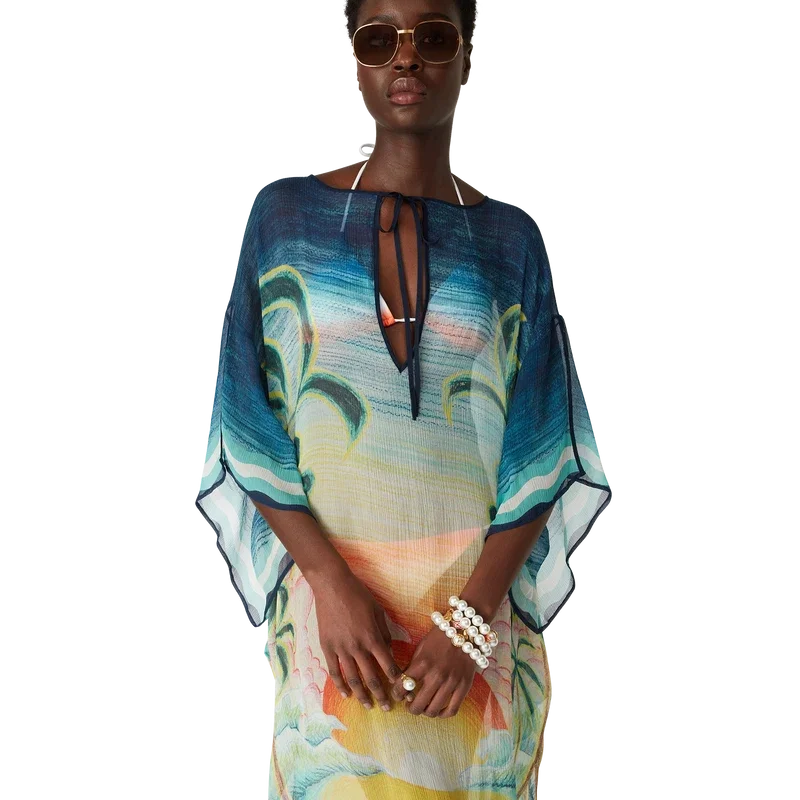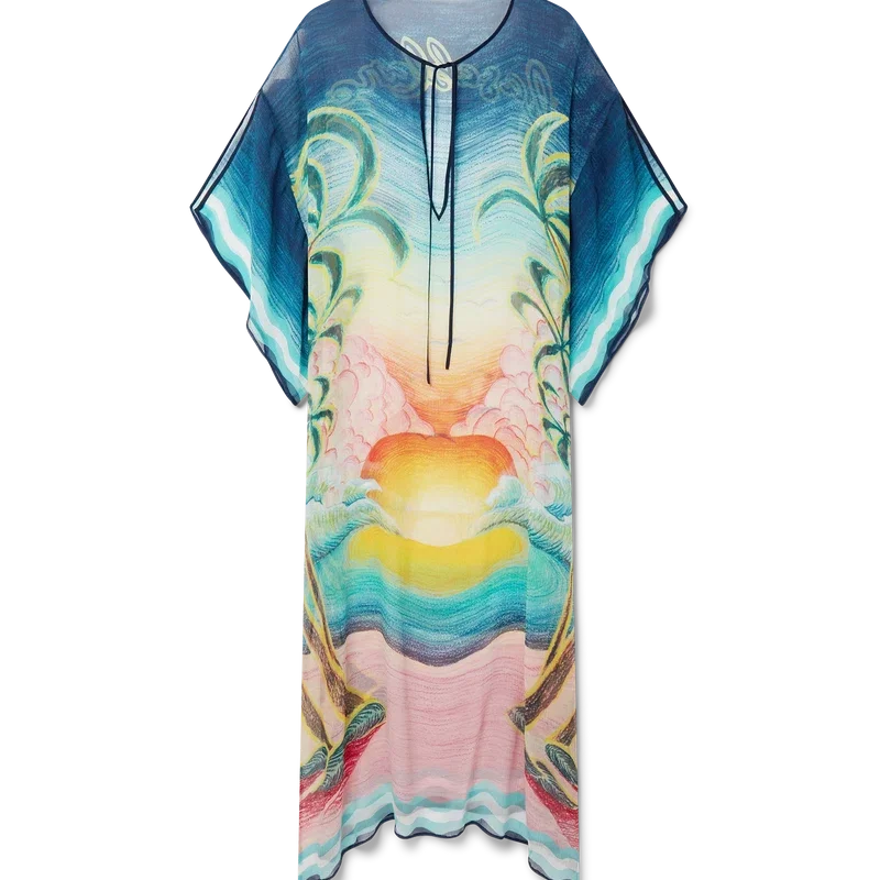 De Danse De La Mer Kaftan is een lichtgewicht ontwerp met een losse pasvorm, vervaardigd uit bedrukte zijden stof met handgeschilderde taferelen die speciaal voor de collectie zijn gemaakt. Afgewerkt met wijde mouwen, zijsplitten en een V-hals met koordjesluiting.