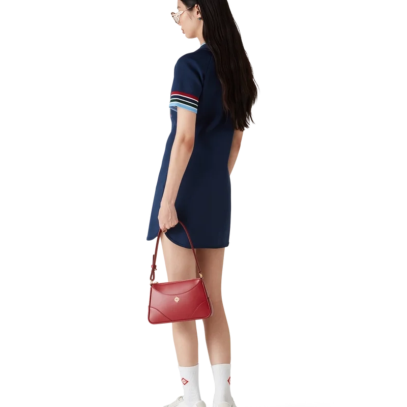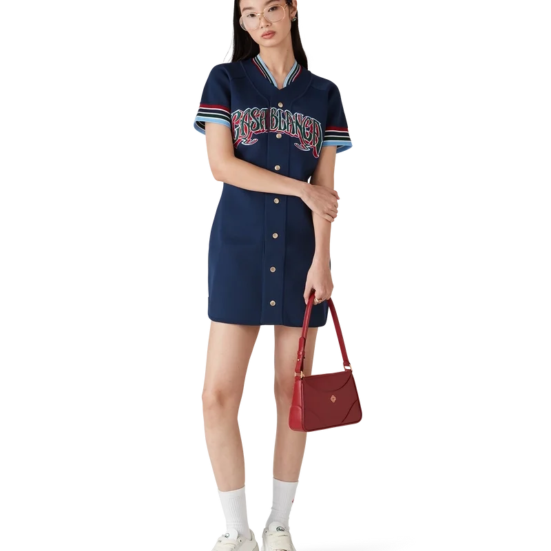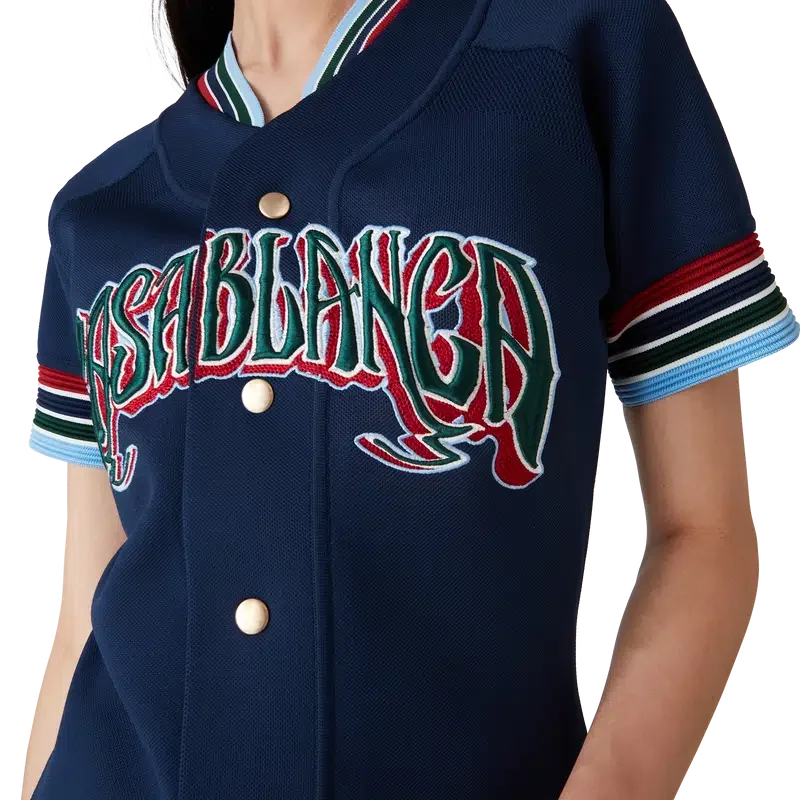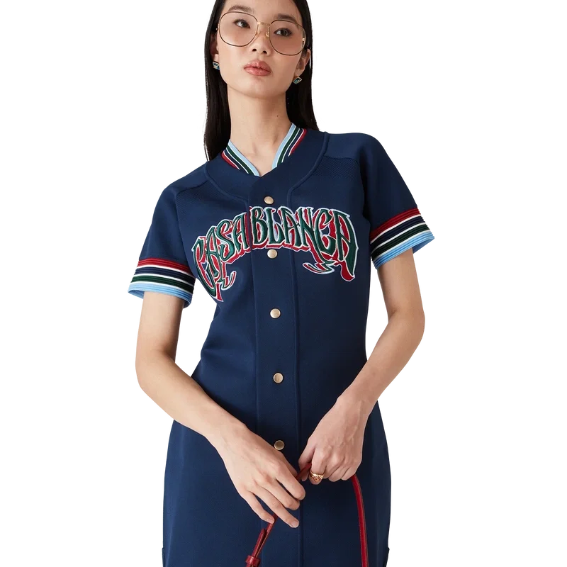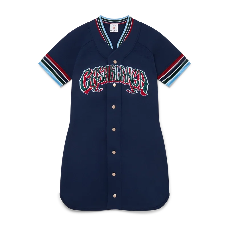 De gebreide baseballjurk is een mini-model, vervaardigd van gebreide stof met geborduurde, handgetekende typografie van het Casablanca-logo, geïnspireerd op het gotische lettertype dat in tatoeages wordt gebruikt. Afgewerkt met knoopsluiting, vergulde drukknopen met merklogo, contrasterende rode, witte, marineblauwe, groene en blauwe streepjes op de manchetten en kraag, en een afgeronde zoom.