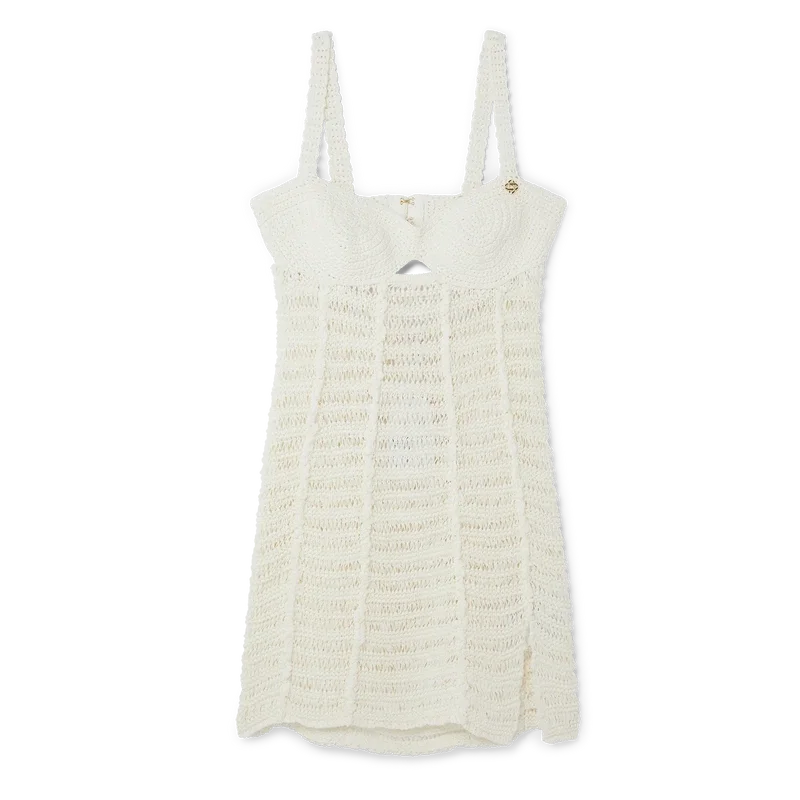 De gehaakte bustierjurk is een mini-model, vervaardigd van een open geweven katoenmix, met een getailleerde bralette en een diep uitgesneden rug. Afgewerkt met haak-en-oogsluiting, een vergulde in elkaar grijpende Cc-klinknagel en schouderbandjes.