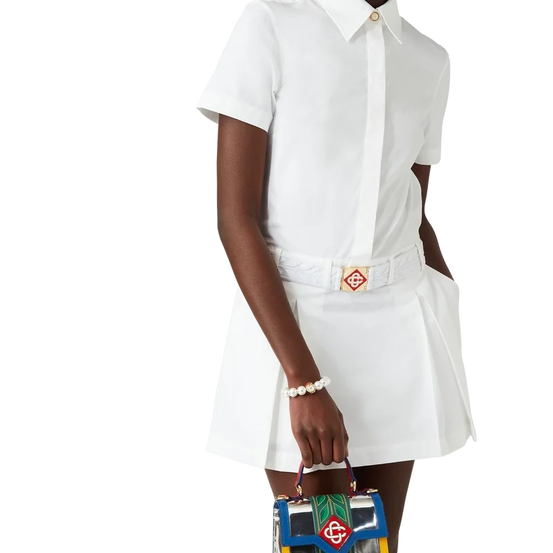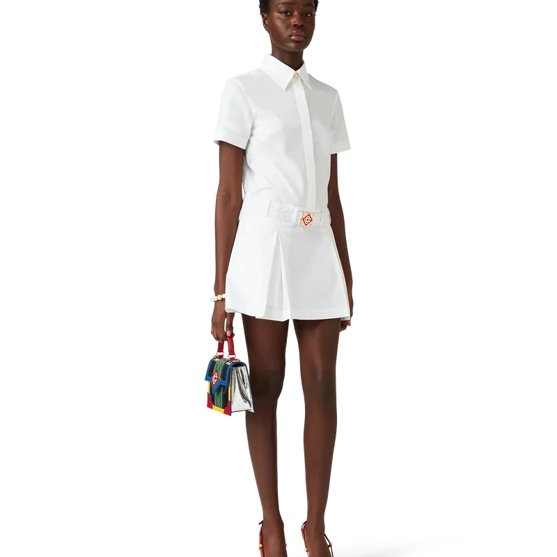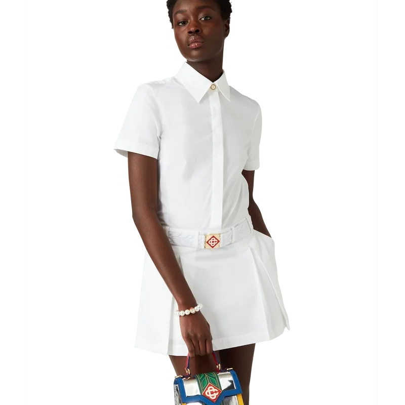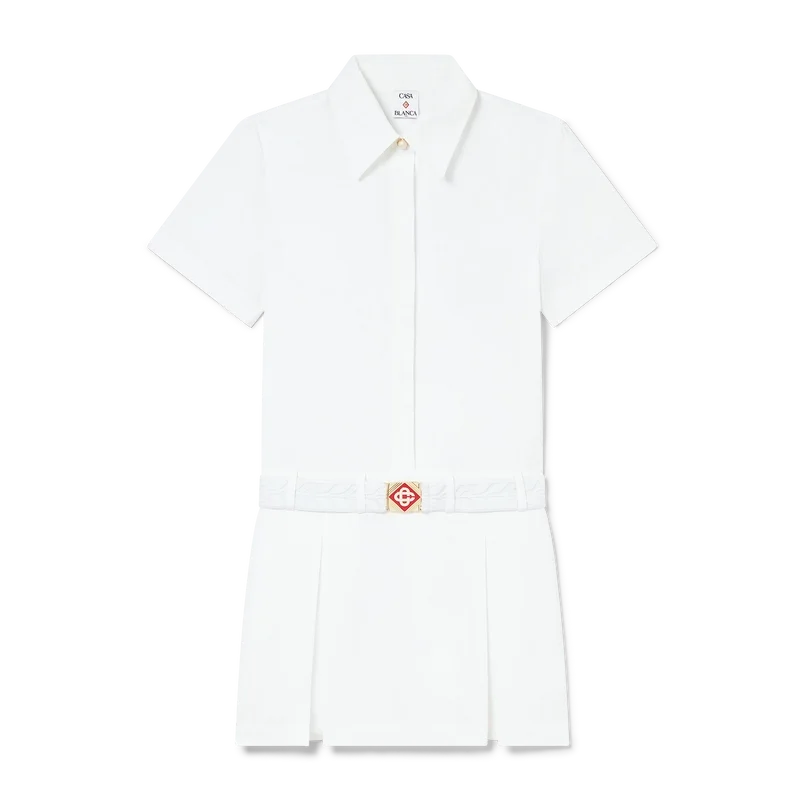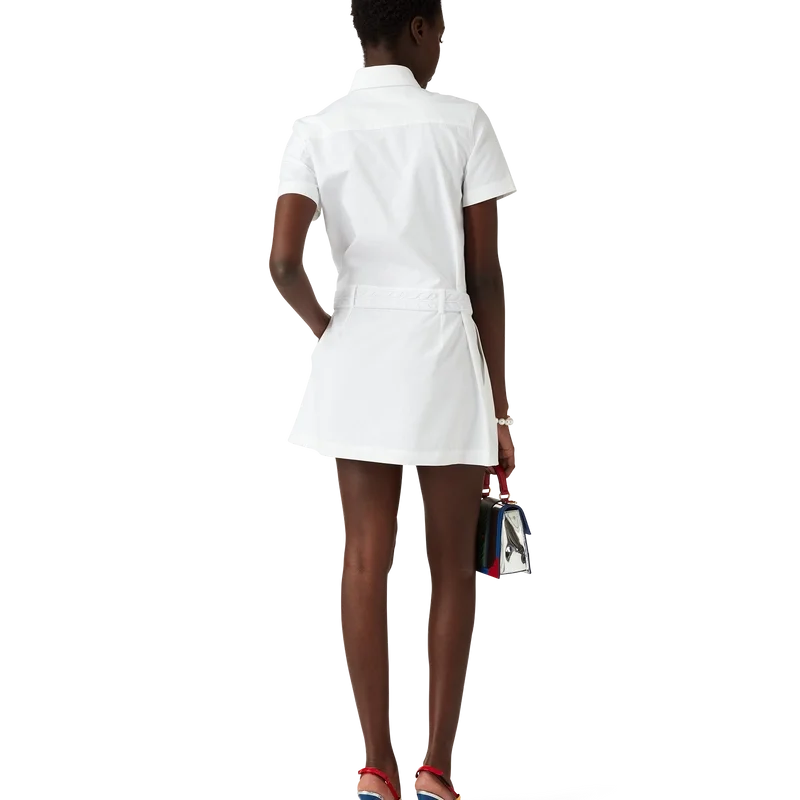 De geplooide tennisminijurk is een minijurk met korte mouwen en een A-lijn silhouet, vervaardigd uit katoenen twill. Afgewerkt met een knoopsluiting aan de voorkant, een open kraag, een borstzakje, een tailleband en een omgekeerd geplooid rokpaneel.