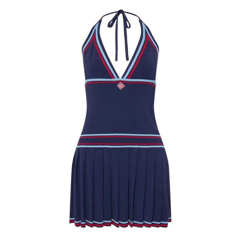 De geplooide halterjurk is een mini-model met een getailleerd lijfje, gemaakt van gebreide stof met het kenmerkende diamantlogo van het huis.