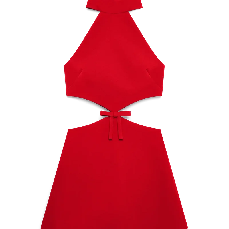De jurk met uitsnijdingen is een mouwloos, A-lijn mini-ontwerp met uitsnijdingen aan de zijkanten. Afgewerkt met ritssluiting, een halternek met een bandkraag en strikdetail in de taille waar de stof taps toeloopt.
