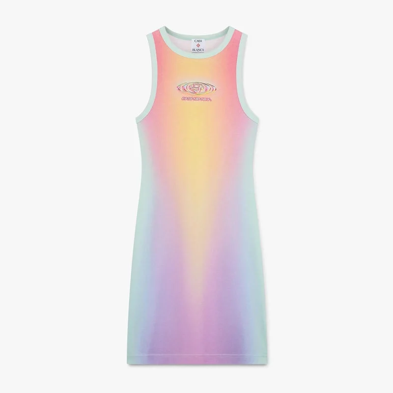 De Glass Gradient Maxi Tank Jurk is een verfijnd ontwerp, voorzien van de seizoensgebonden Glass Gradient-illustratie, gecreëerd in samenwerking met Martin Naumann, bekend om zijn werk met kleurverlopen en textuureffecten, met halftoon- en glasachtige effecten. Afgewerkt met een ronde halslijn, mouwloos silhouet, het Warped-logo van het huis en een Casablanca-logo met een glasachtig effect op de voorkant.
