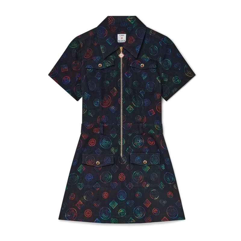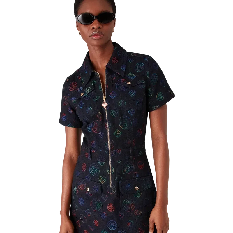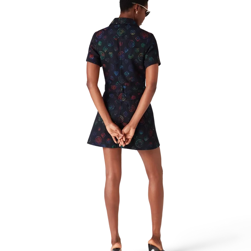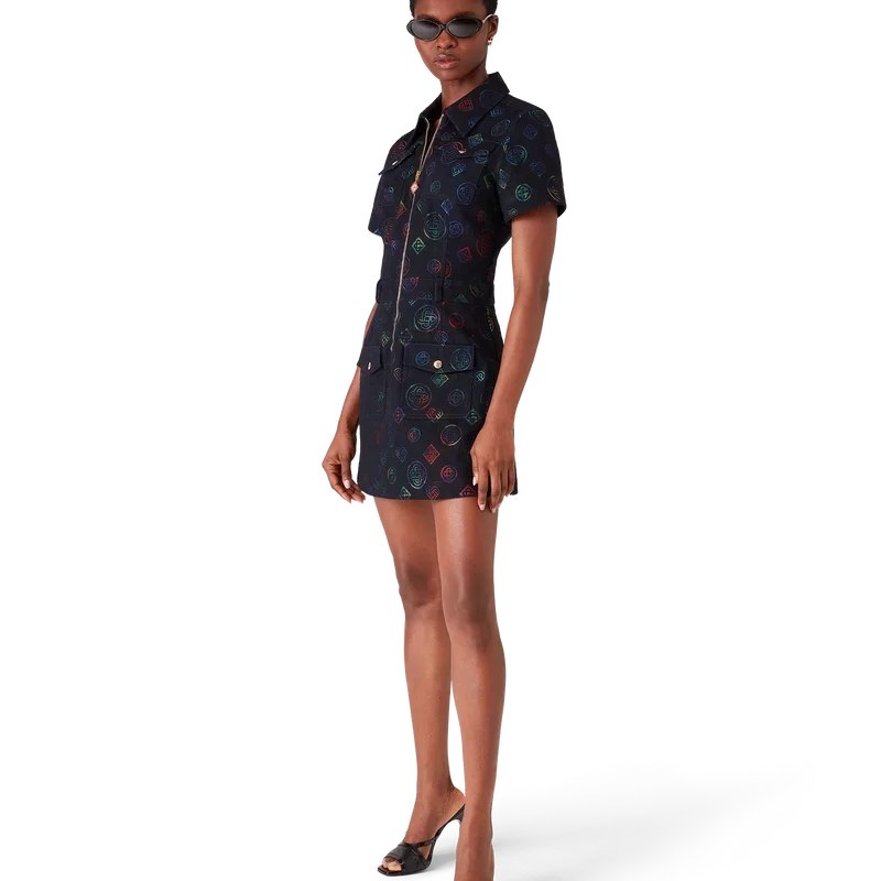 De Heatmap Monogram Denim Jurk is een A-lijn mini-jurk met korte mouwen, vervaardigd uit katoenen denim met het kenmerkende Heatmap-ontwerp van dit seizoen. Afgewerkt met een ritssluiting aan de voorkant met het kenmerkende diamantlogo van het huis, riemlussen, klepzakken en vergulde hardware met merklogo.