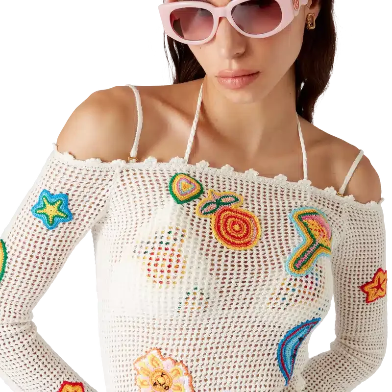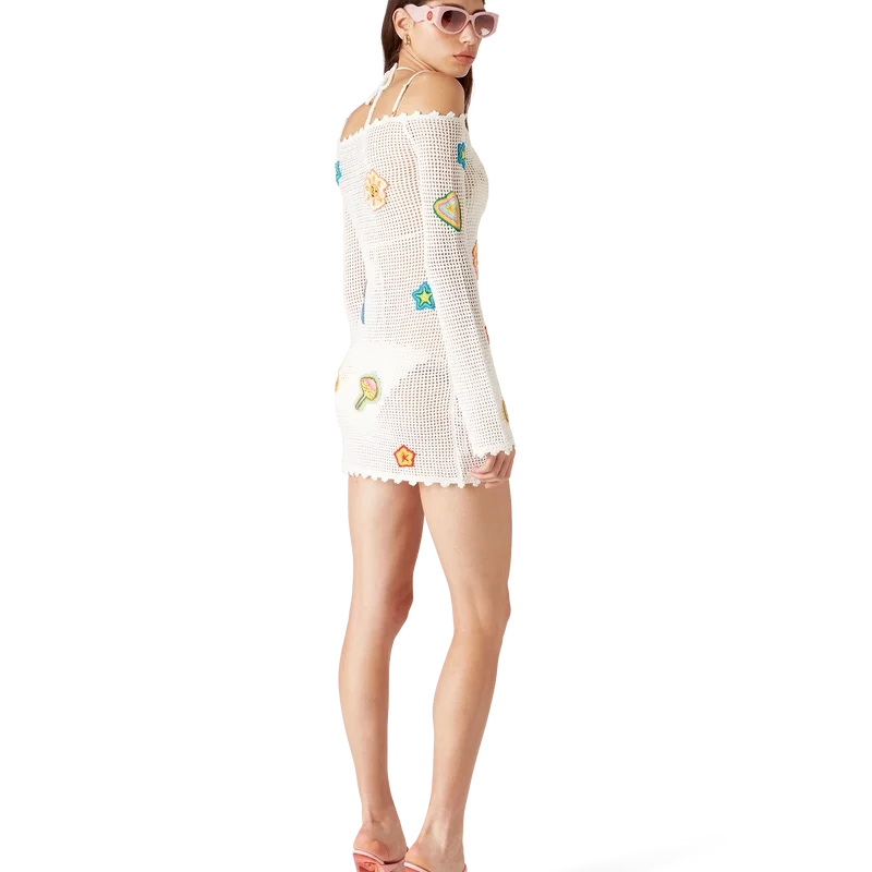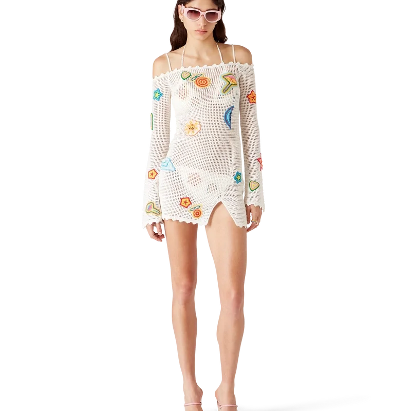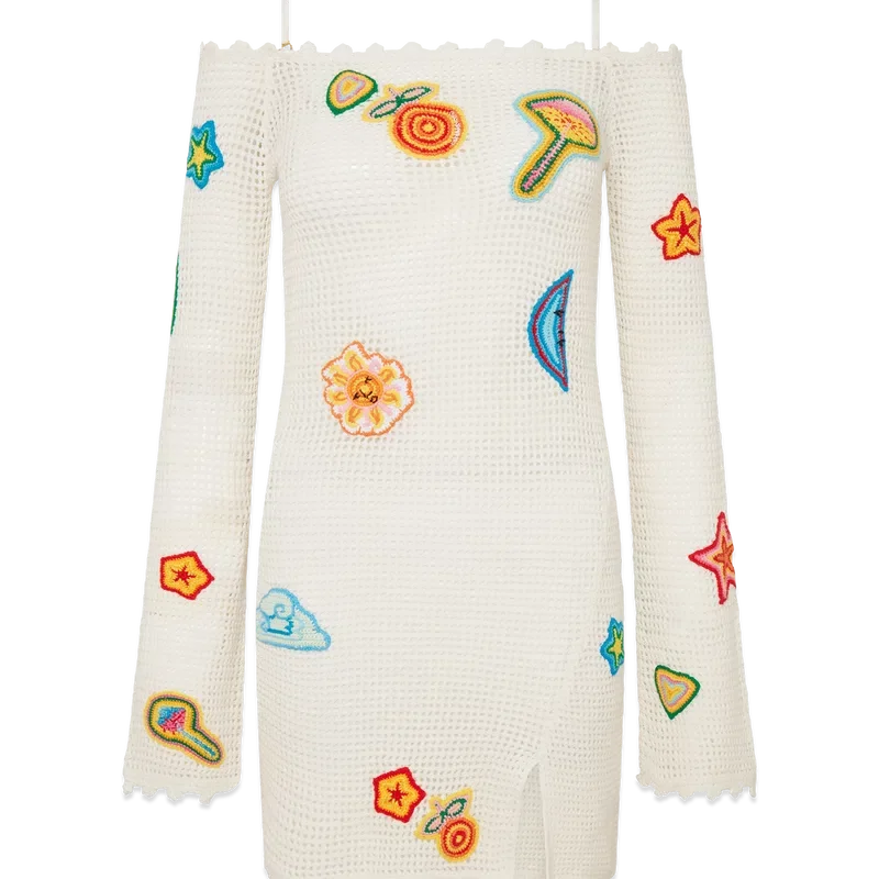 De Motif Crochet Jurk is een gebreide mini-jurk met lange mouwen, vervaardigd van gehaakte stof en voorzien van de kenmerkende designelementen van het huis. Afgewerkt met klokmouwen met splitdetail, een boothals en een splitdetail aan de zoom.