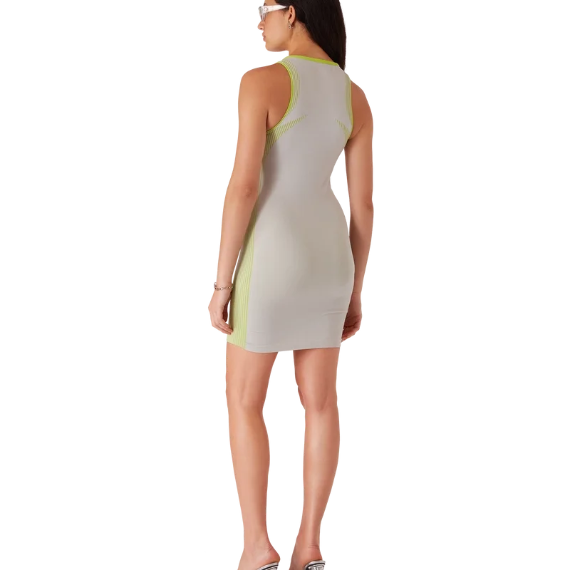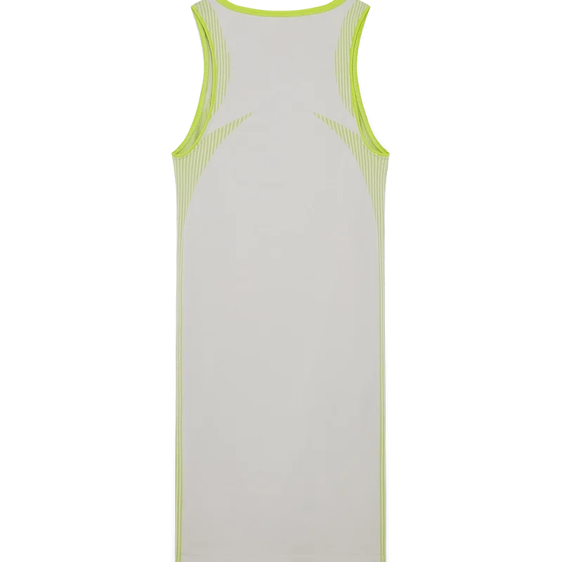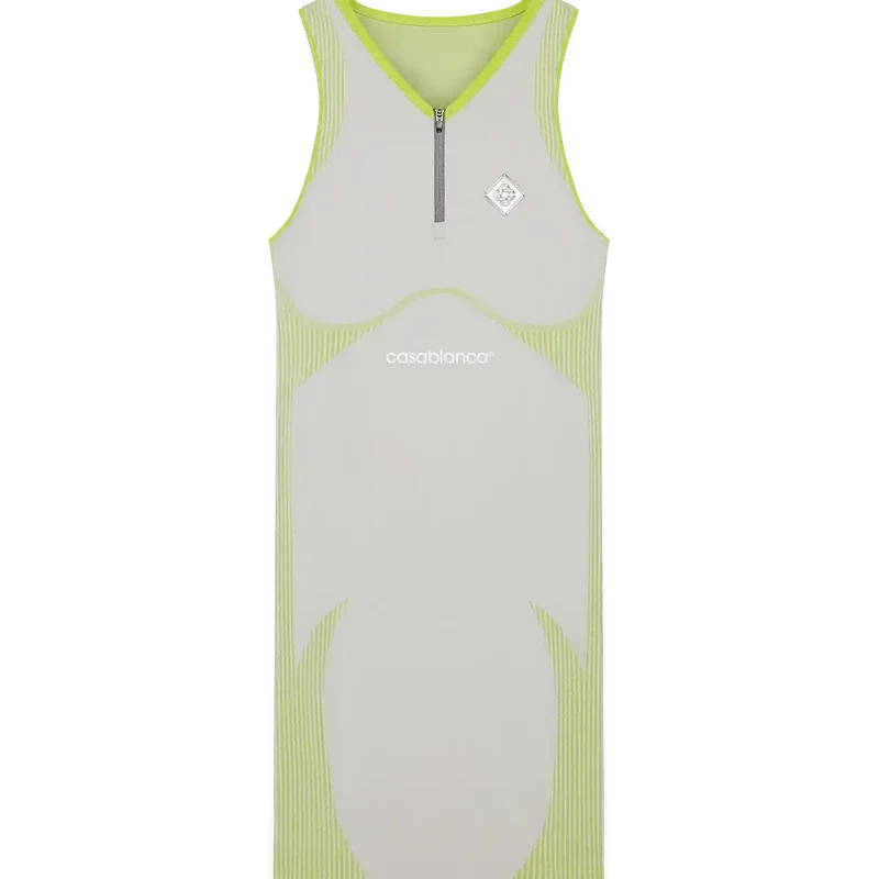 De naadloze jurk is een mouwloos, getailleerd ontwerp met het zilveren diamantlogo van het huis en het Casablanca-logo in het midden. Afgewerkt met een ondiepe V-halslijn, een ritssluiting met het kenmerkende diamantritslipje van het huis en paneeldetails voor extra ondersteuning.