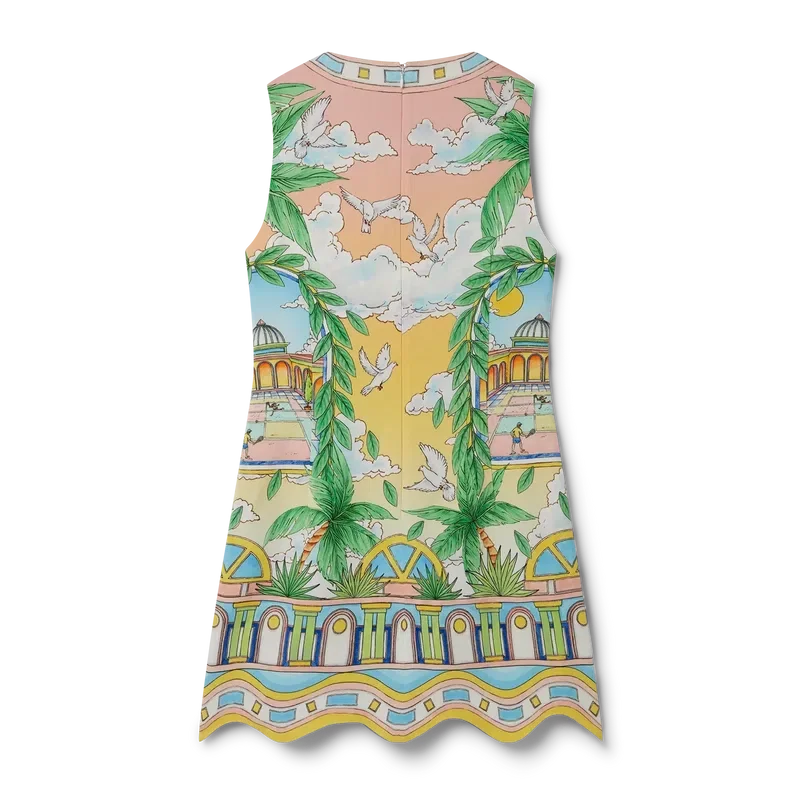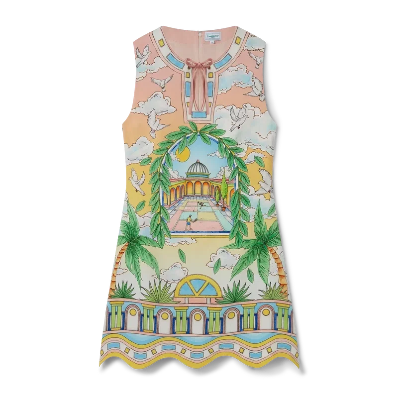 De Paysage Ideal Cocktailjurk is een mouwloze mini-jurk met een A-lijn silhouet, voorzien van seizoensgebonden kunstwerken met een traditionele lay-out die zich richt op de boog, symmetrie en het ideale universum van Casablanca, met een licht en idealistisch kleurenpalet dat de etherische thema’s benadrukt die centraal staan in ons merk. Afgewerkt met een ritssluiting aan de achterkant, een V-hals en een zoomdetail geïnspireerd op de Memphis-golf – een van de fundamentele ontwerpelementen van ons merk.