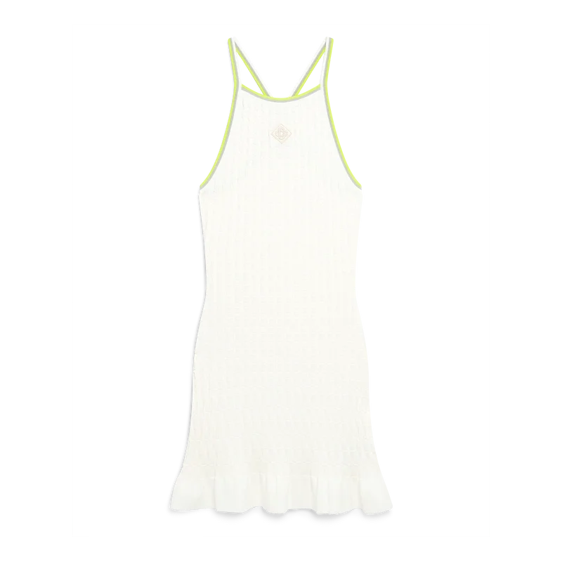 De tennisminijurk met bandjes is een bedrukt ontwerp met het diamantlogo van het huis in het midden. Afgewerkt met groene randdetails, een zoom met ruches en een klassiek, op tennis geïnspireerd silhouet.