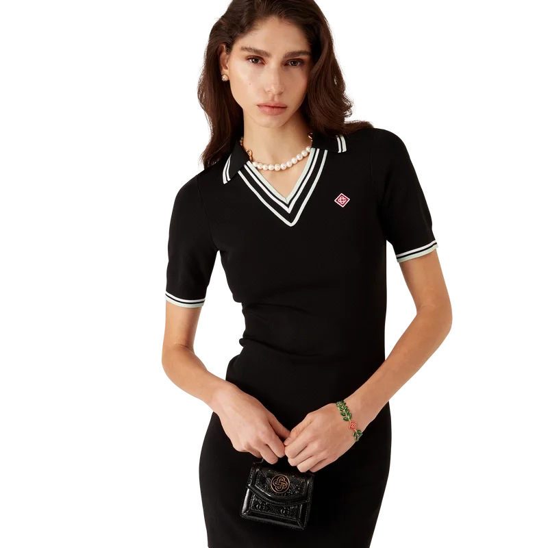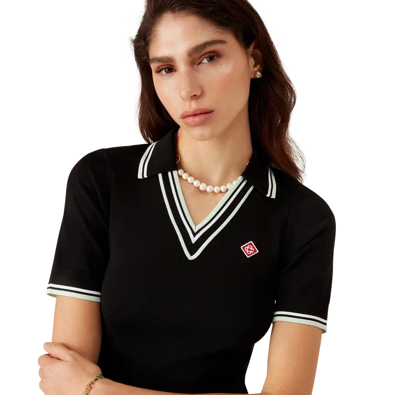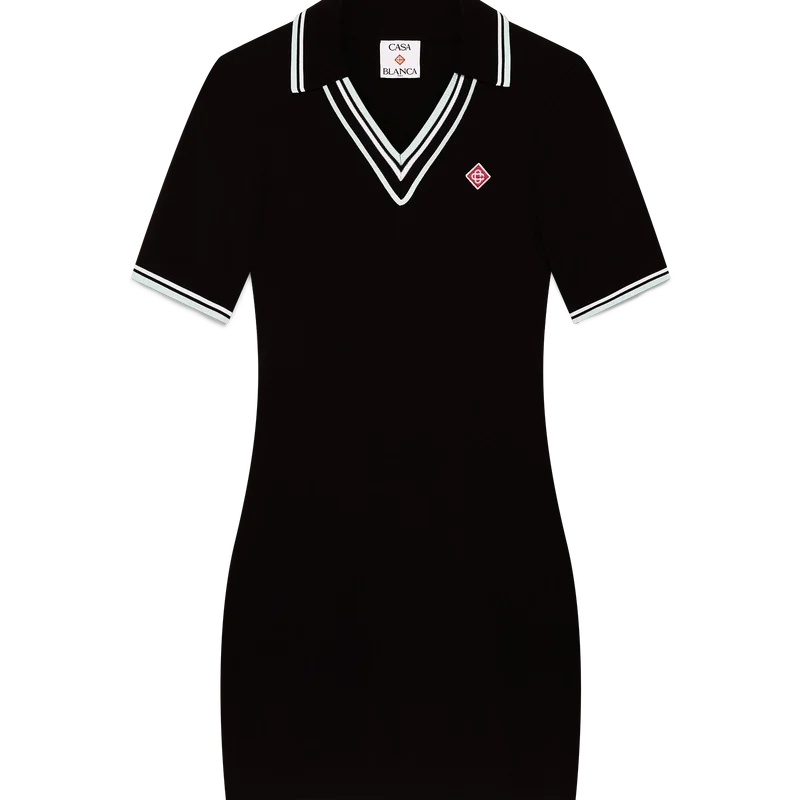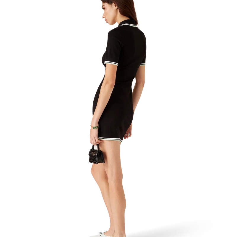 De viscose V-hals jurk is een ontwerp met korte mouwen, vervaardigd uit gebreide stof en voorzien van het kenmerkende diamantlogo van het huis. Afgewerkt met een geribde kraag en zwarte, witte en mintkleurige streepjes aan de kraag, manchetten en zoom.