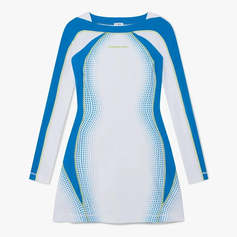 De witte halftoon stretch tennis maxi-jurk is een ontwerp met lange mouwen, voorzien van het kenmerkende Casablanca-logo van het huis. Afgewerkt met een boothals, streepjesdetail over de hals, schouders en mouwen, en in een A-lijn slim silhouet.