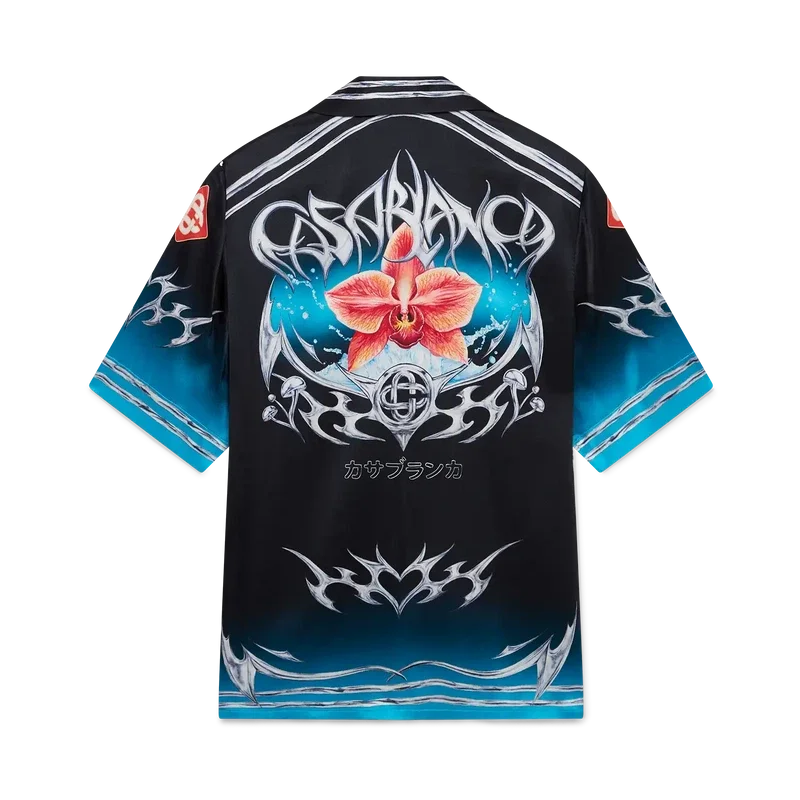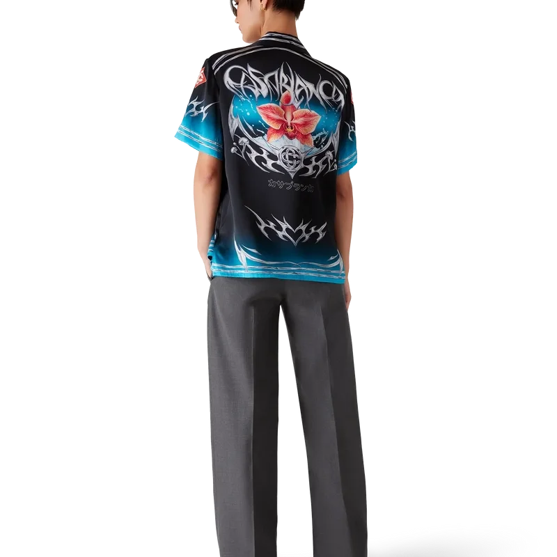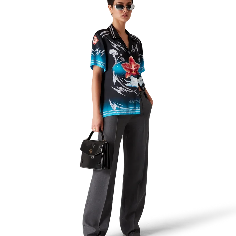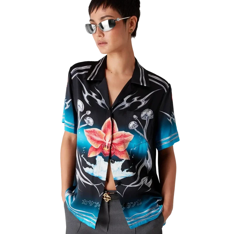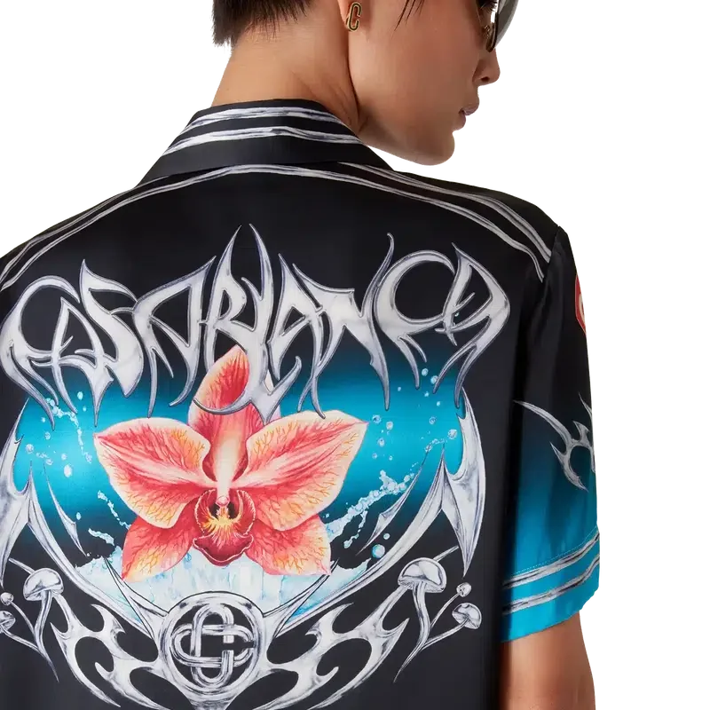 Het Blades zijden satijnen overhemd met korte mouwen heeft een print met een ontwerp dat speelt met het contrast tussen twee tegengestelde gevoelens: de scherpte van het mes en het koude, zilveren chroom, in contrast met de warmte van de natuur, zoals de opvallende roze en rode tinten van een orchidee. De toevoeging van water geeft het ontwerp een fris, helder element. Afgewerkt met een Cubaanse kraag, een borstzak, een knoopsluiting en kenmerkende in elkaar grijpende Cc Corozo-knopen.