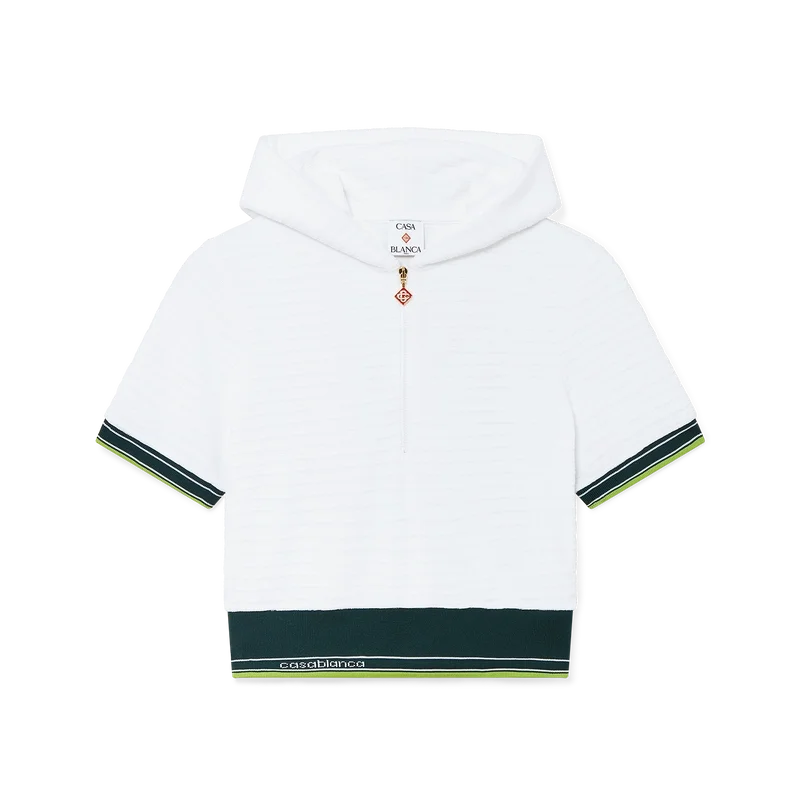 De cropped hoodie van getextureerd velours is een ontwerp met korte mouwen, gemaakt van velours. Afgewerkt met een capuchon, een kwartritssluiting met het kenmerkende diamantlogo van het huis, contrasterende geribde manchetten en een zoom met gestreepte randdetails.
