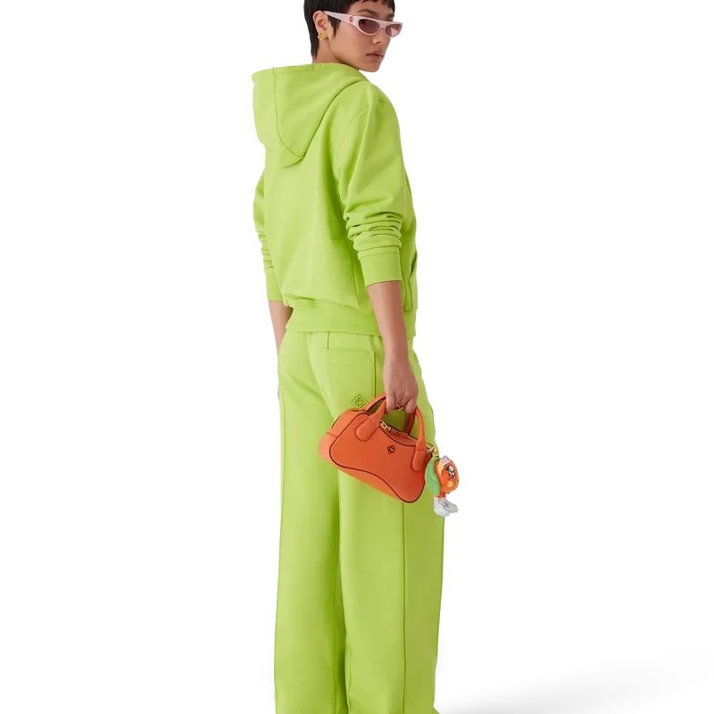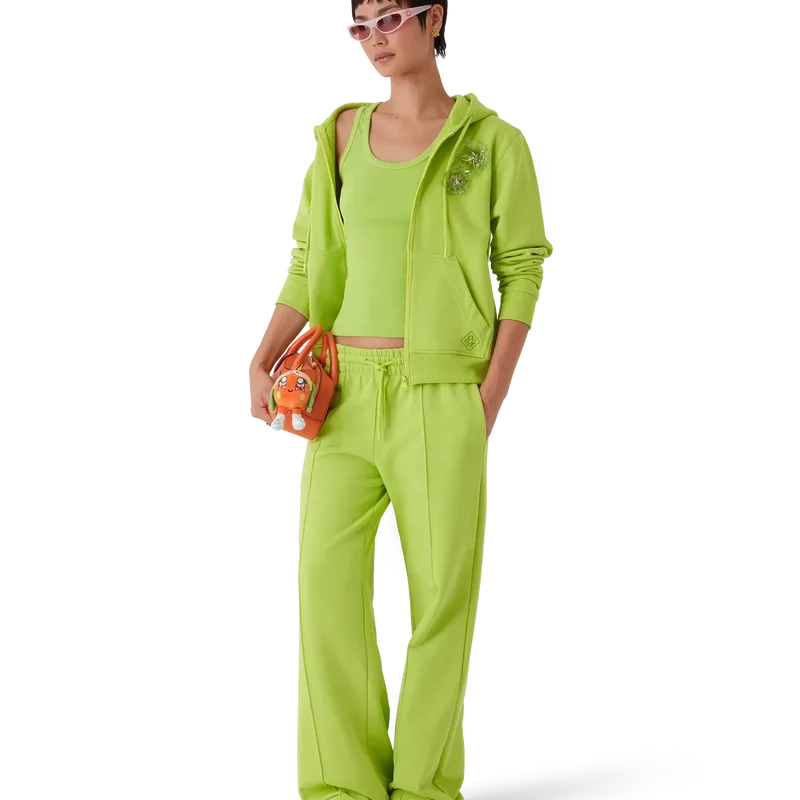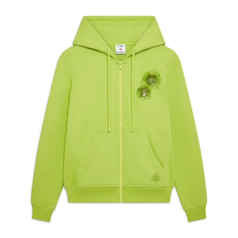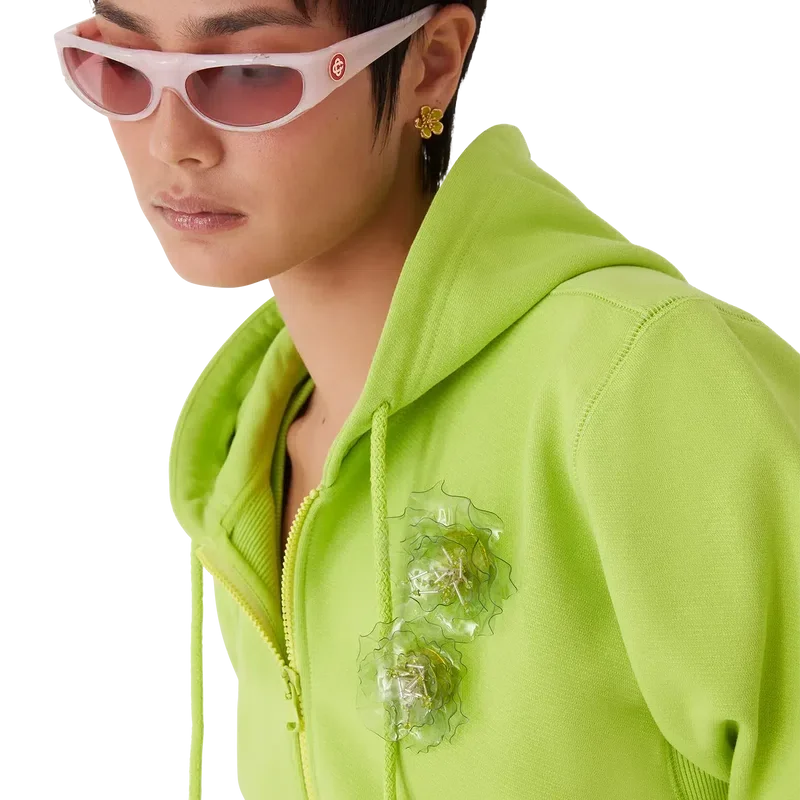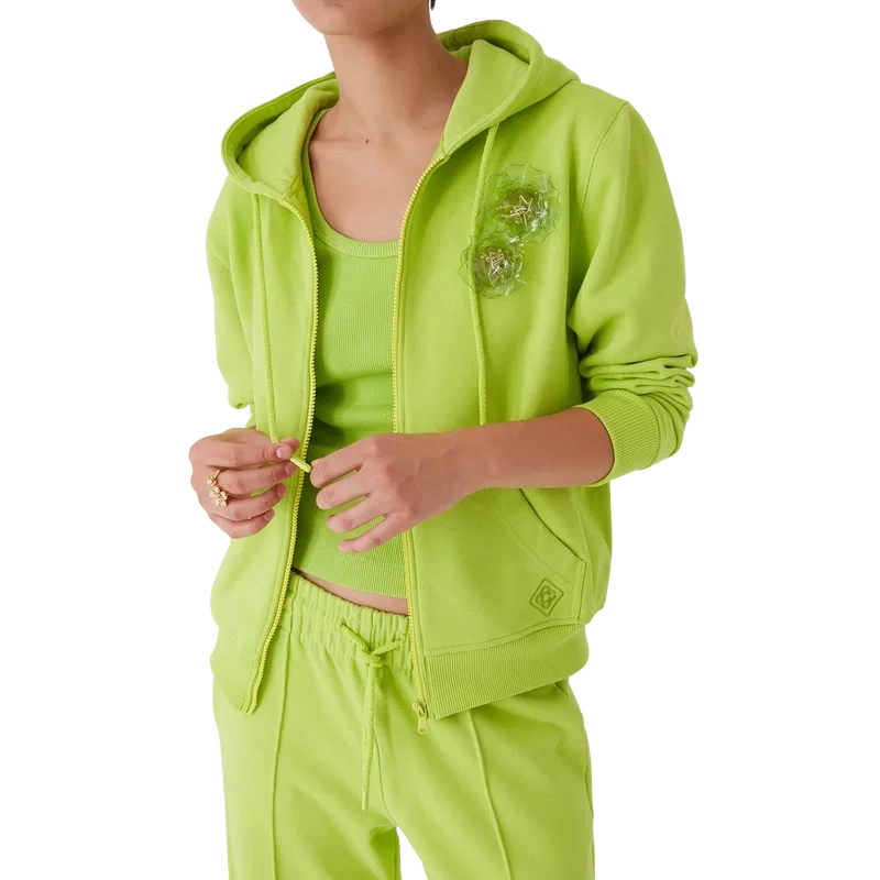 De hoodie met rits is een sportief ontwerp met lange mouwen in limoengroen met twee afneembare bloemenbroches. Afgewerkt met een capuchon met trekkoord, een ritssluiting, opgestikte zakken aan de voorkant, geribde manchetten en een geribde zoom.