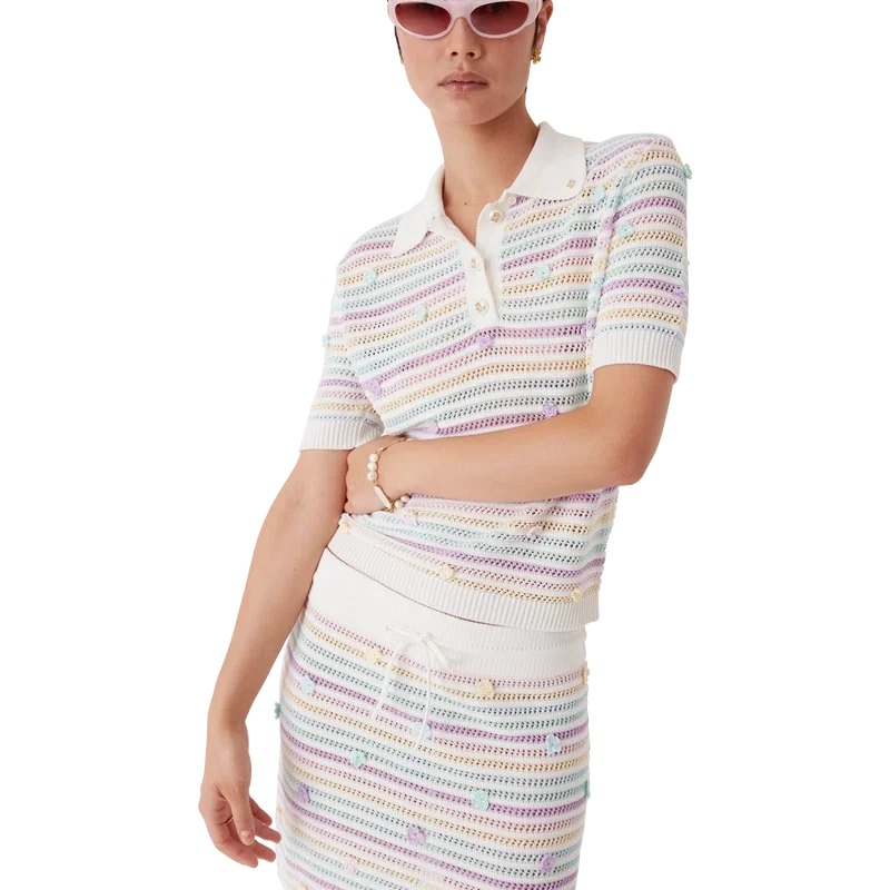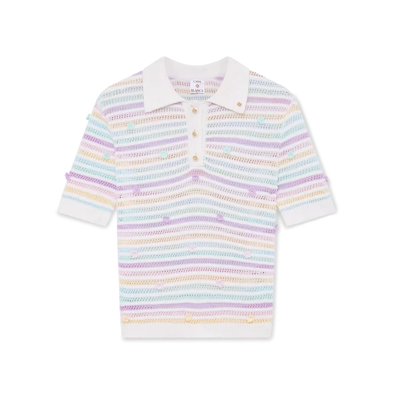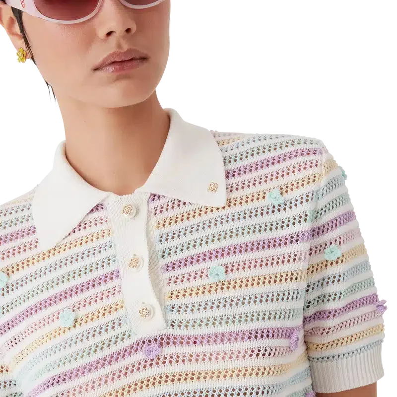 Het katoenen gehaakte Poloshirt met bloemenstrepen is een klassiek ontwerp met korte mouwen, vervaardigd uit een open geweven katoenen stof. Afgewerkt met kenmerkende gouden parelknopen, bloemmotieven, een geribde kraag, manchetten, een knoopsluiting en details aan de zoom.
