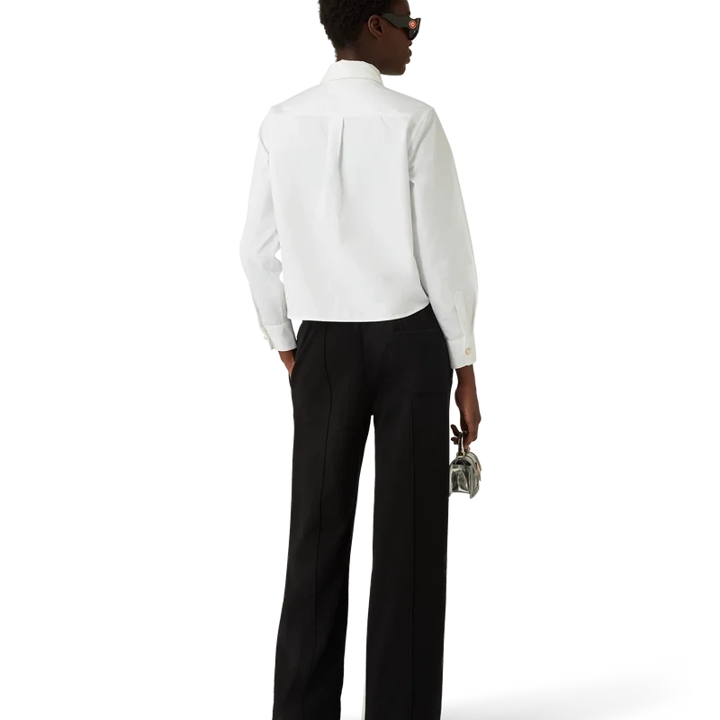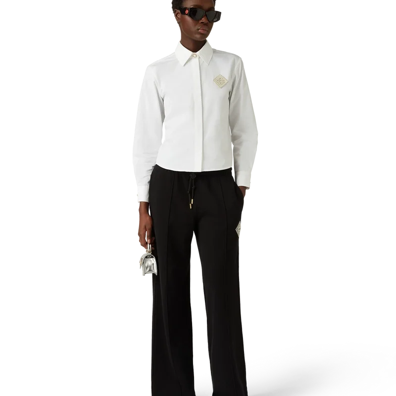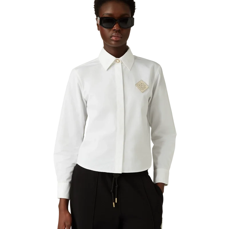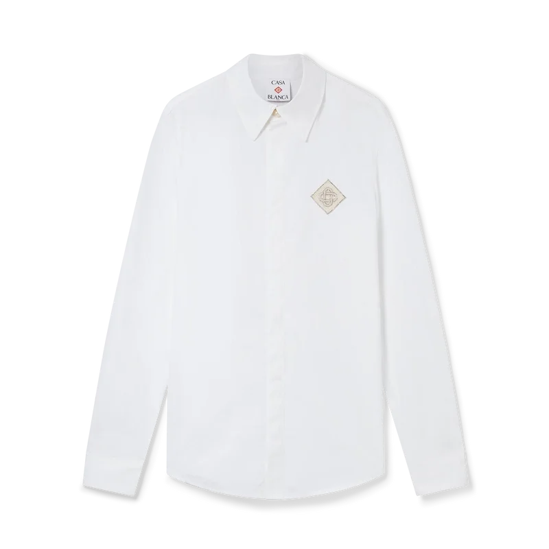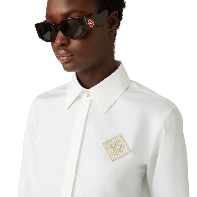 Het katoenen overhemd met parel-diamantpatch is een ontwerp met lange mouwen, vervaardigd uit katoen en voorzien van het kenmerkende diamantlogo van het huis, dat voor dit seizoen opnieuw is geïnterpreteerd. Afgewerkt met een klassieke puntkraag, kenmerkende gouden parelknopen met rand aan de kraag en op de manchetten, en een verborgen knoopsluiting.