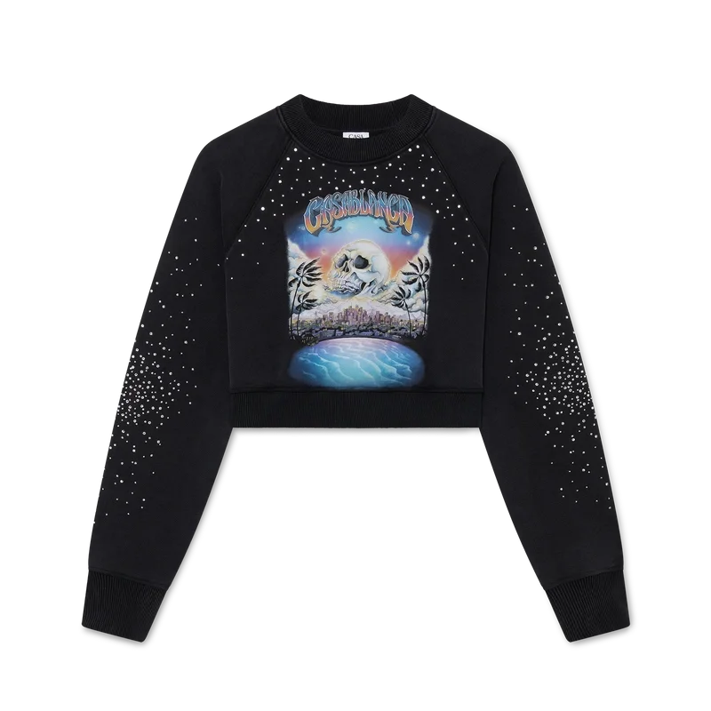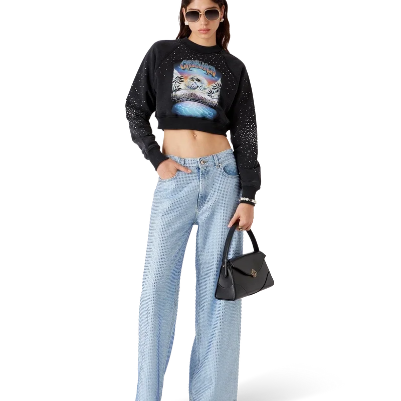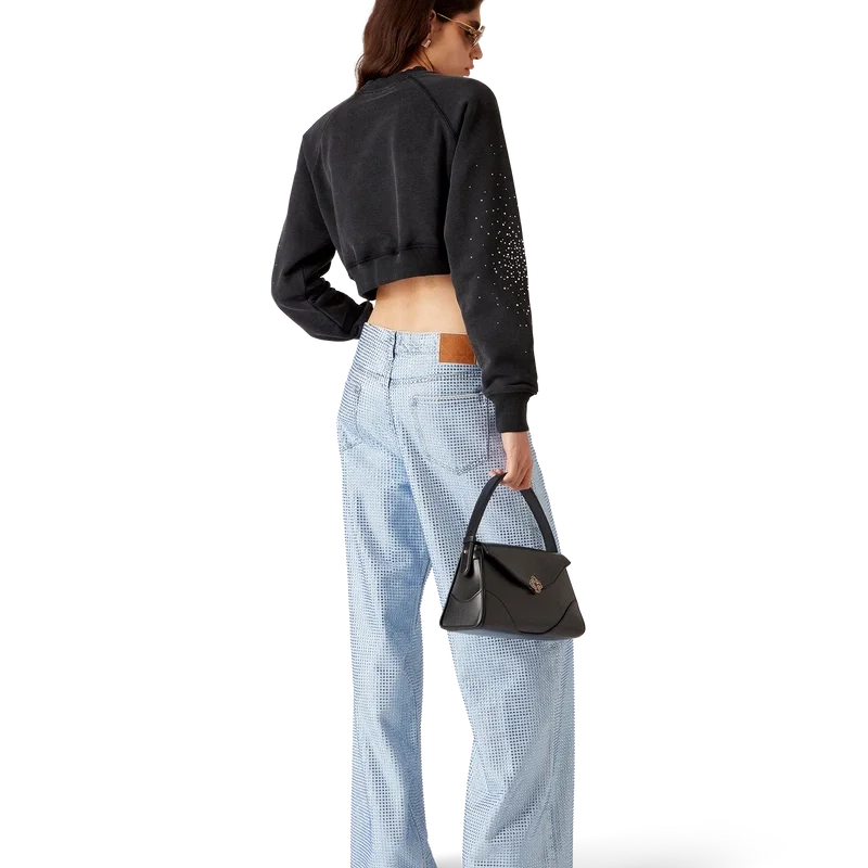 De La Pramonition-denimshort met kristallen versiering is een knielange short met een relaxed silhouet, gemaakt van denimstof en volledig bedekt met hotfix-glaskralen. Afgewerkt met een voering, voor- en achterzakken, ritssluiting en riemlussen.<!–