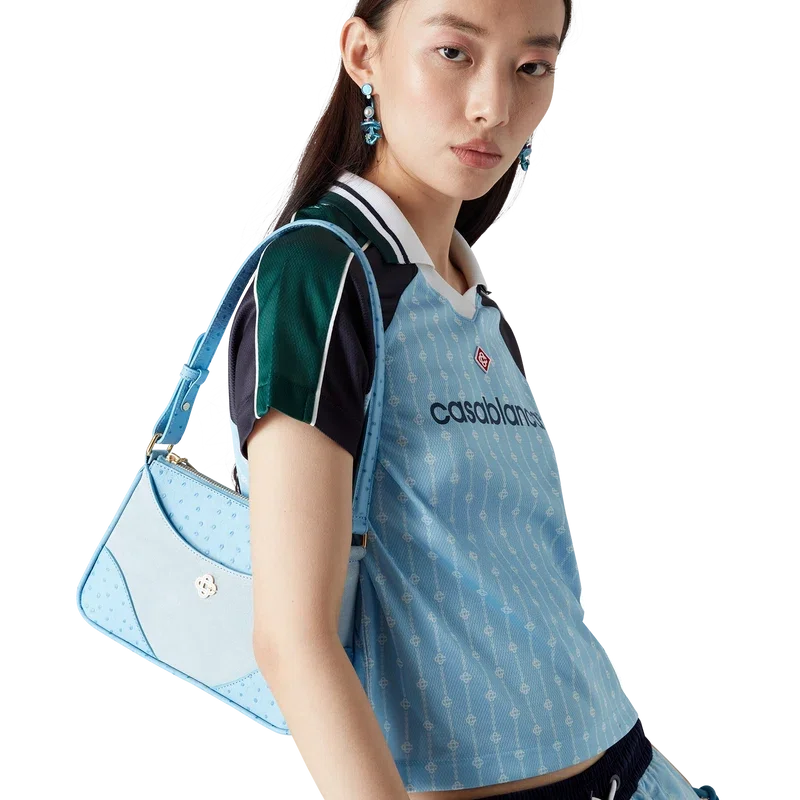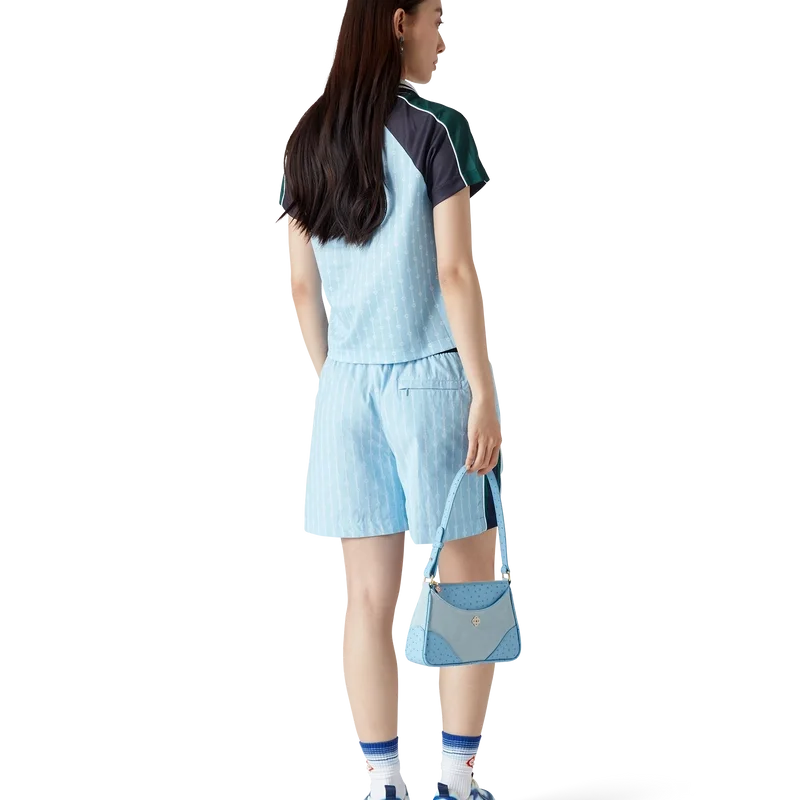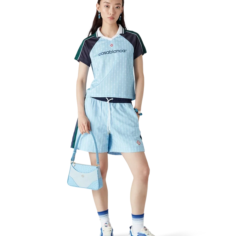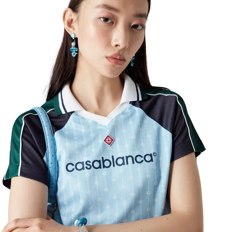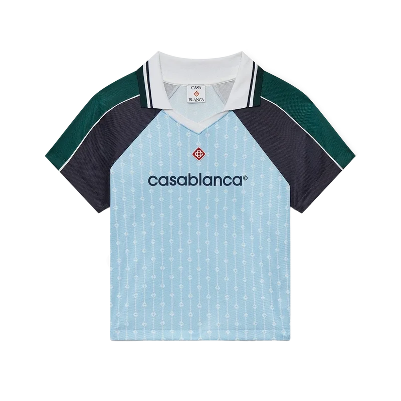 Het Pinstripe Laurel voetbalshirt is een sportshirt met korte mouwen, vervaardigd uit een Birdseye-meshstof en voorzien van het kenmerkende in elkaar grijpende CC-logo van het merk. Afgewerkt met zwarte en groene panelen op de schouders en mouwen, een kenmerkend diamantlogo, het Casablanca-logo, witte biezen, een geribde V-hals en een kraag met een rand in zwarte, witte en groene strepen.