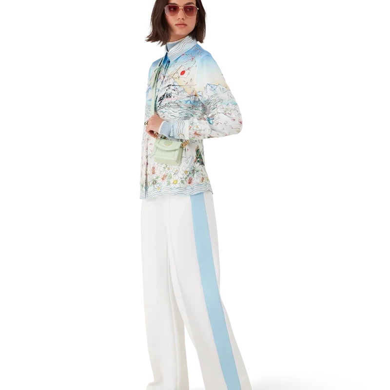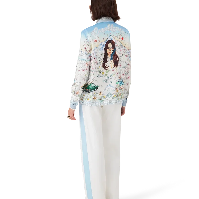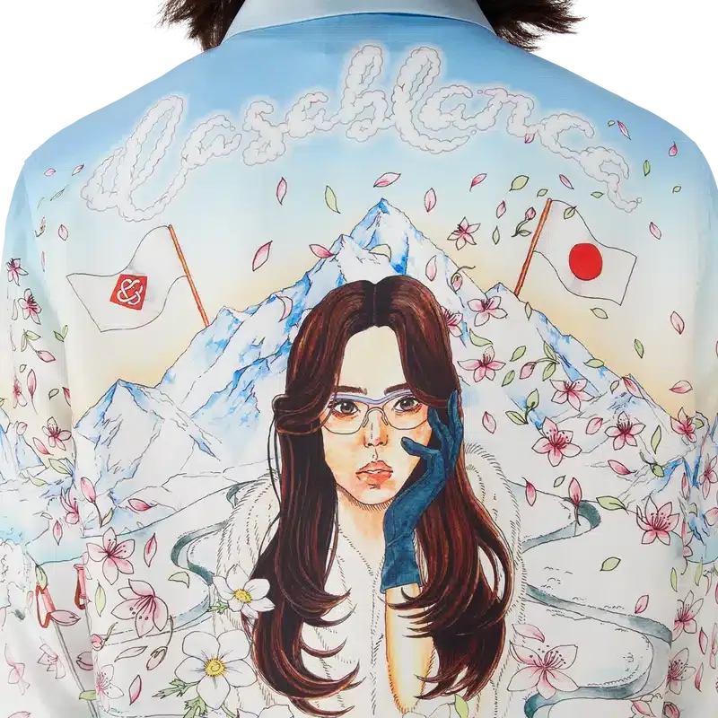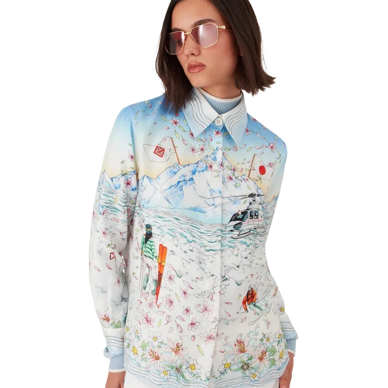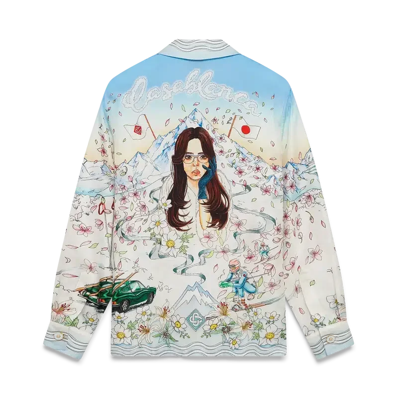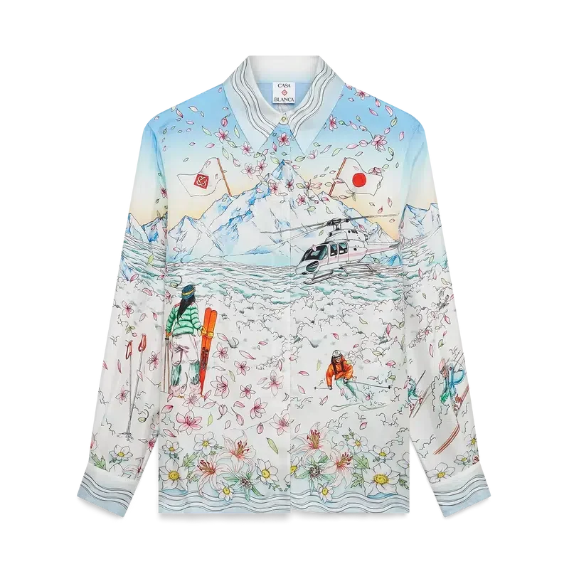 Het L’hiver Fleuri-overhemd met lange mouwen van zijden twill is een kenmerkend overhemdontwerp met de L’hiver Fleuri-print van dit seizoen, geïnspireerd op de natuurlijke schoonheid van Hokkaido. Dit ontwerp toont een roze zonsopgang tegen een achtergrond van imposante bergformaties en is een eerbetoon aan de winterbestemmingen in Japan met een geïdealiseerde weergave van besneeuwde vergezichten, compleet met kersenbloesemblaadjes, gespoorde skipaden en winteruitrusting.