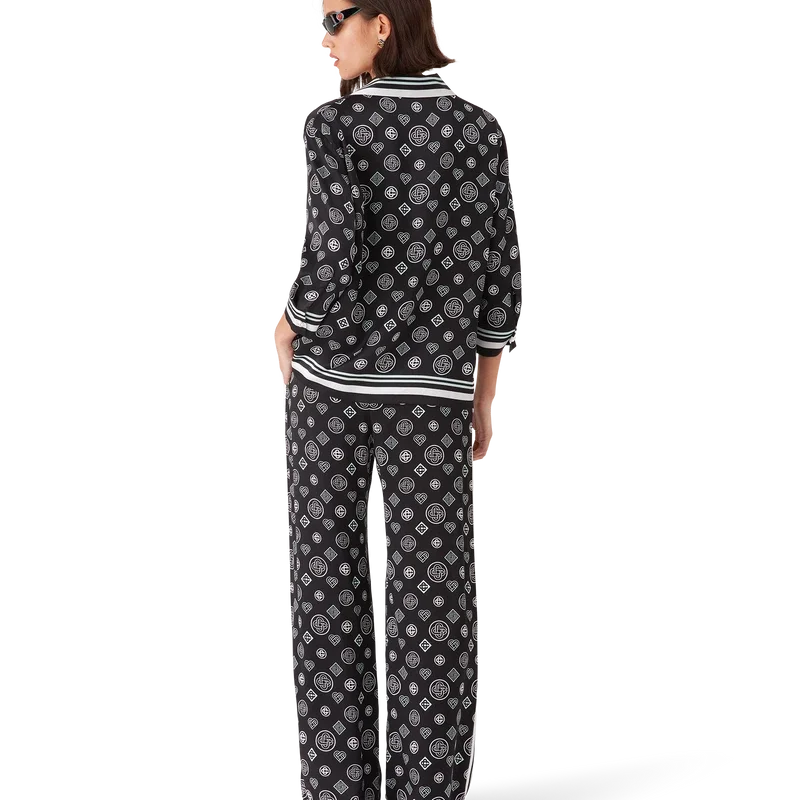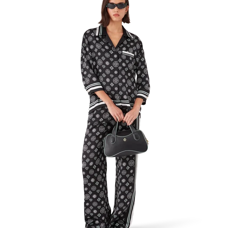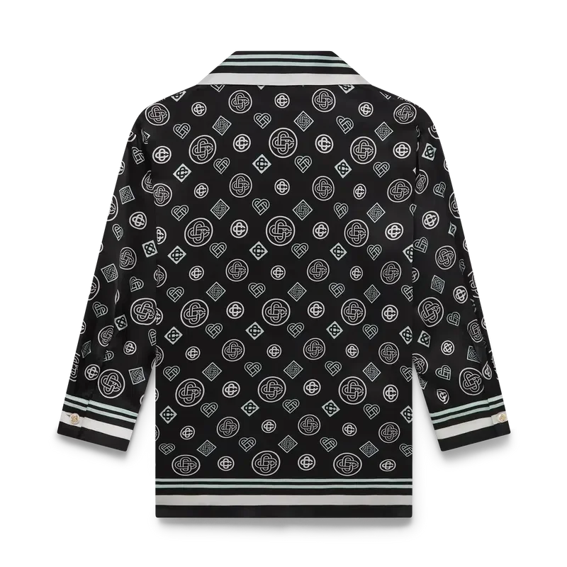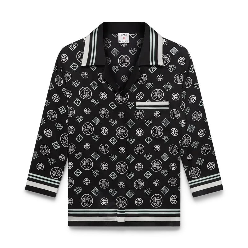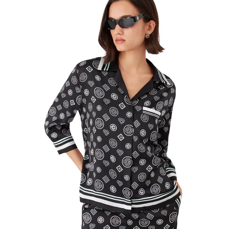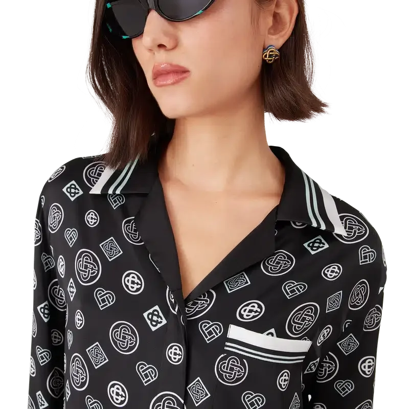 Het Monogram zijden satijnen pyjamadoek heeft een all-over print met het Honeydew-logo van dit seizoen. Dit patroon verschilt van onze andere monogrammen, omdat het unieke vormen combineert tot een samenhangend geheel. Het is meer een op iconen gebaseerd ontwerp. Afgewerkt met halflange mouwen, een borstzak, een Cubaanse kraag, knoopsluiting, kenmerkende in elkaar grijpende CC-logoknopen en zwart-witte streepdetails op de kraag, manchetten, zoom en zak.