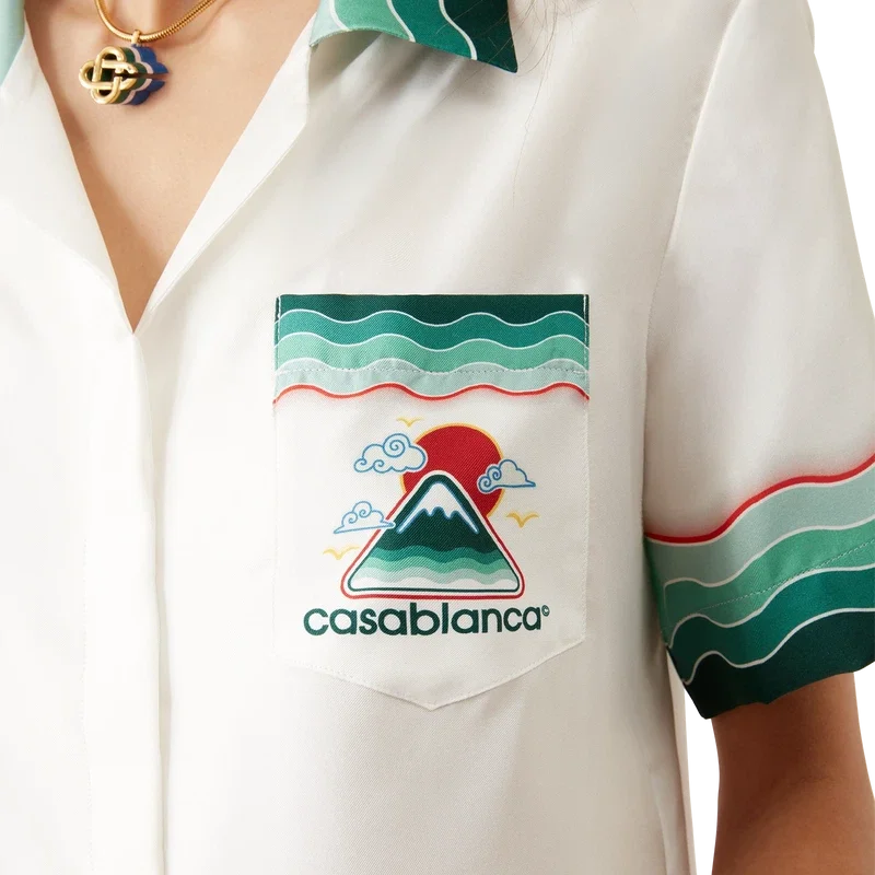 Het Montagne Ondulee zijden shirt met korte mouwen heeft een all-over print met het seizoensgebonden artwork van het huis – geïnspireerd door de rijke iconografie van Japan, met een eenvoudige lay-out en artwork, dat met slechts enkele lijnen en kleuren een sterke visuele boodschap overbrengt, waardoor het een van de emblemen van de collectie is – vervaardigd van zijden twill. Afgewerkt met een Cubaanse kraag, verborgen knoopsluiting, in elkaar grijpende Cc-logo Corozo-knopen en op de Memphis Wave geïnspireerde gestreepte randdetails op de kraag, manchetten en zoom.