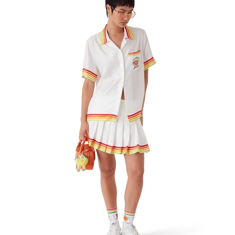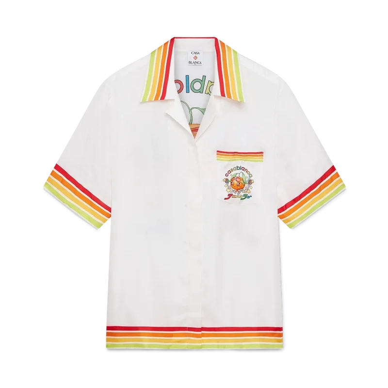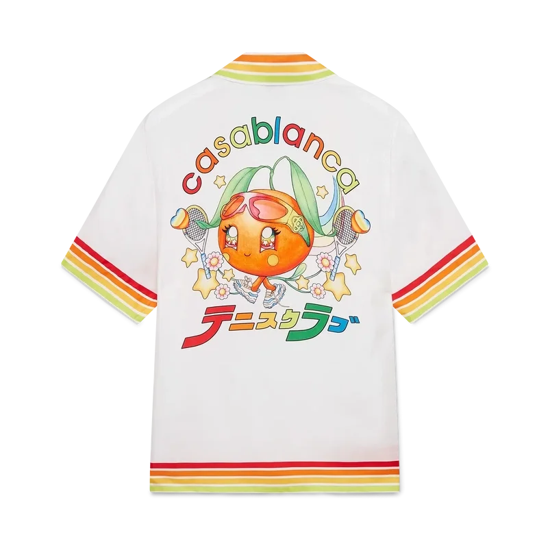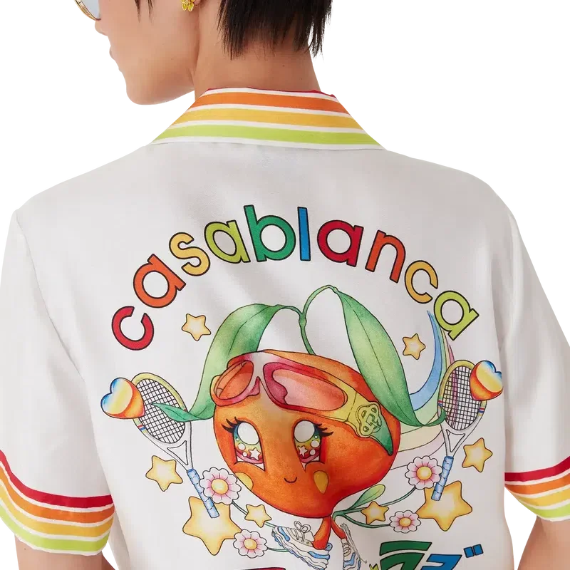 Het Kawaii Orange Mascot-shirt met korte mouwen van zijden twill heeft een bedrukt ontwerp met seizoensgebonden illustraties van de Kawaii Orange. Dit personage, ontworpen in de vorm van een sinaasappel, is een sleutelfiguur in ons universum en draagt Casa-accessoires, een bril en sneakers. Ze komt vooral voor in de damesmodellen van de collectie. Afgewerkt met een Cubaanse kraag, knoopsluiting, Corozo-knopen met het Cc-logo, een borstzakje en rode, oranje, gele en groene streepjes aan de randen van de kraag, manchetten, zoom en zak.
